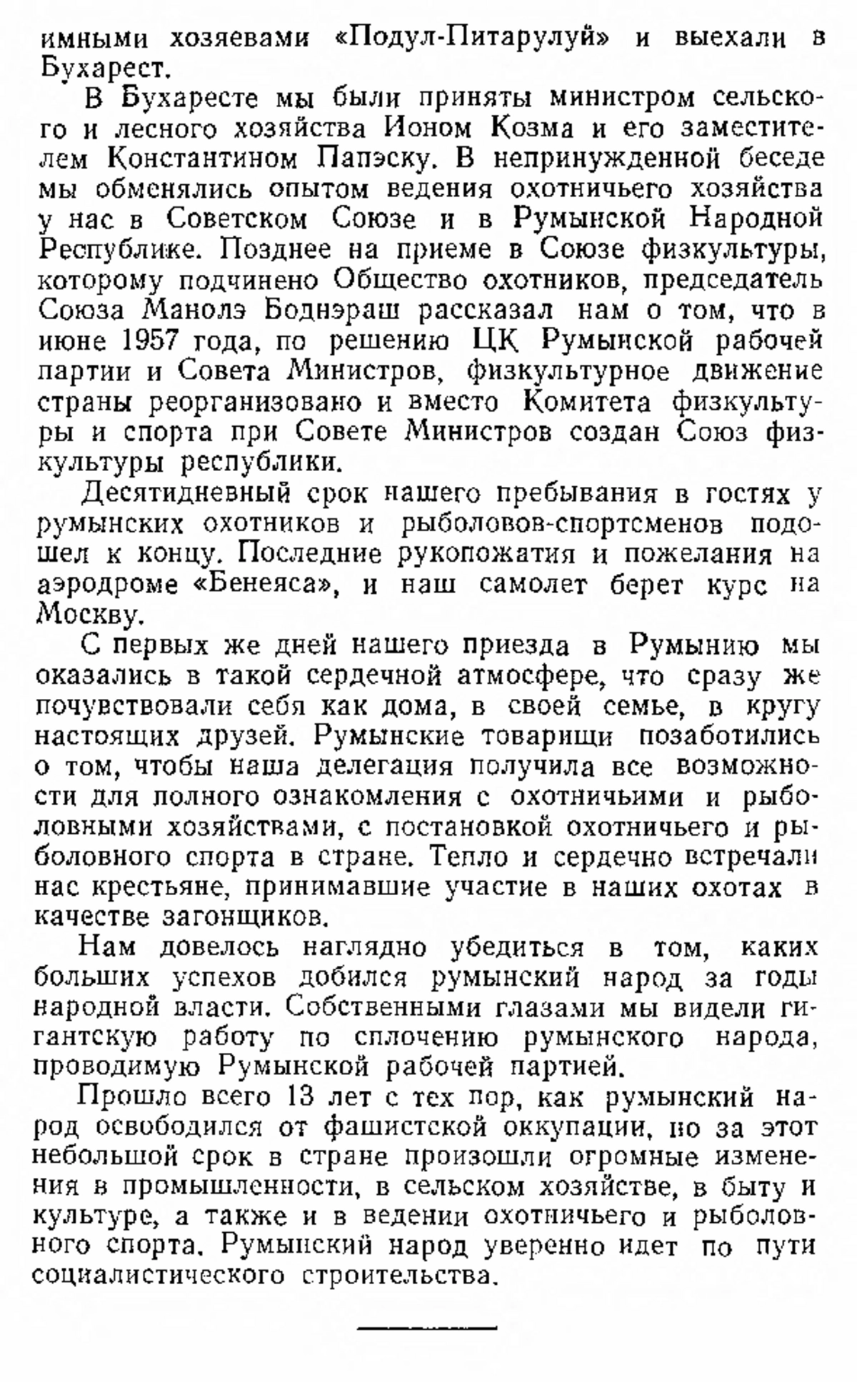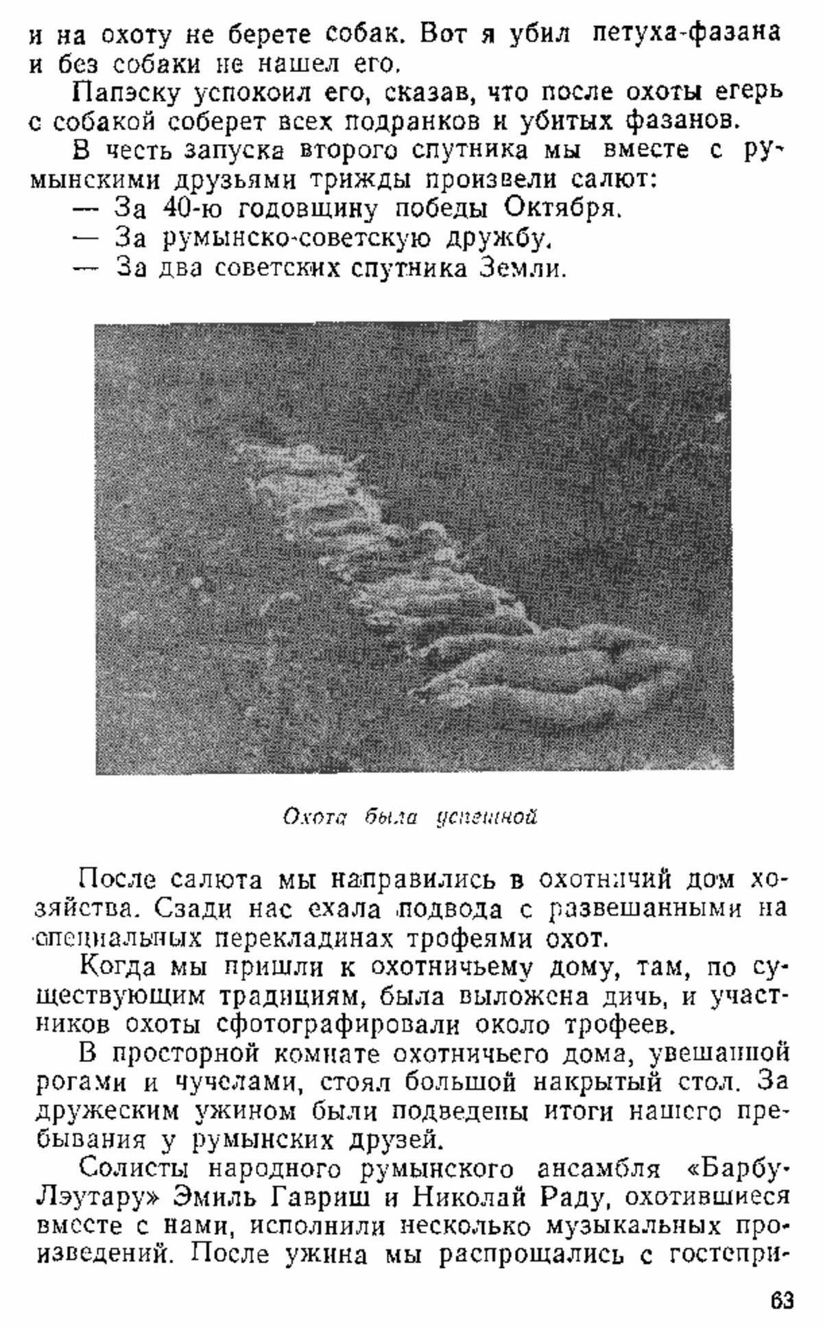 «… За время пребывания в гостях у чехословацких и румынских друзей я встречался с охотниками и рыболовами, посещал охотничьи хозяйства, участвовал в разных охотах, стрелял на стендах и посещал инкубаторные станции, где выводятся куропатки и фазаны. Эти станции одновременно служат и для передержки дичи. За многие годы моей служебной и охотничьей деятельности я бывал на Урале, в Сибири, в Средней Азии, на Кавказе, в Донбассе, в Подмосковье и во многих других областях. Однако у большинства наших охотников я не встречал такой заботы о своем хозяйстве, которую наблюдал среди охотников Чехословакии и Румынии. Нельзя сравнить необъятные просторы Советского Союза с территориями Чехословакии и Румынии. Тем не менее в нашей стране с каждым годом становится все больше и больше охотников, а количество дичи заметно убавляется. Охотники наших больших городов, выезжая на охоту, довольно часто возвращаются домой «без пуха и пера». Пора покончить с устарелым взглядом горе-охотников «на мой век дичи хватит» и «птица божья не сеет, не жнет, а живет… »