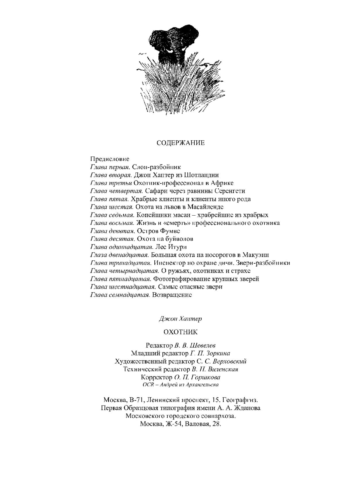 Никакие учебники, справочники, тома энциклопедий не расскажут об Африке так живо и ярко, как это сделает очевидец. Раскройте книгу Джона Хантера и вместе с автором вы пройдете по лесным дебрям, будете охотиться на диких слонов, кабанов, львов, носорогов, уз-наете много о замечательной природе Африки, жизни и быте коренных жителей африканскою континента. Хантер родился в конце прошлого века в Шотландии, юношей он покинул ро-дину и с тех пор жил в Африке, путешествуя по ее саваннам и великим лесам, защищая африканское население от опасных хищников. Хантер искренне любит природу. животных, он настоящий друг Африки и африканцев, о которых пишет с симпатией и уважением.