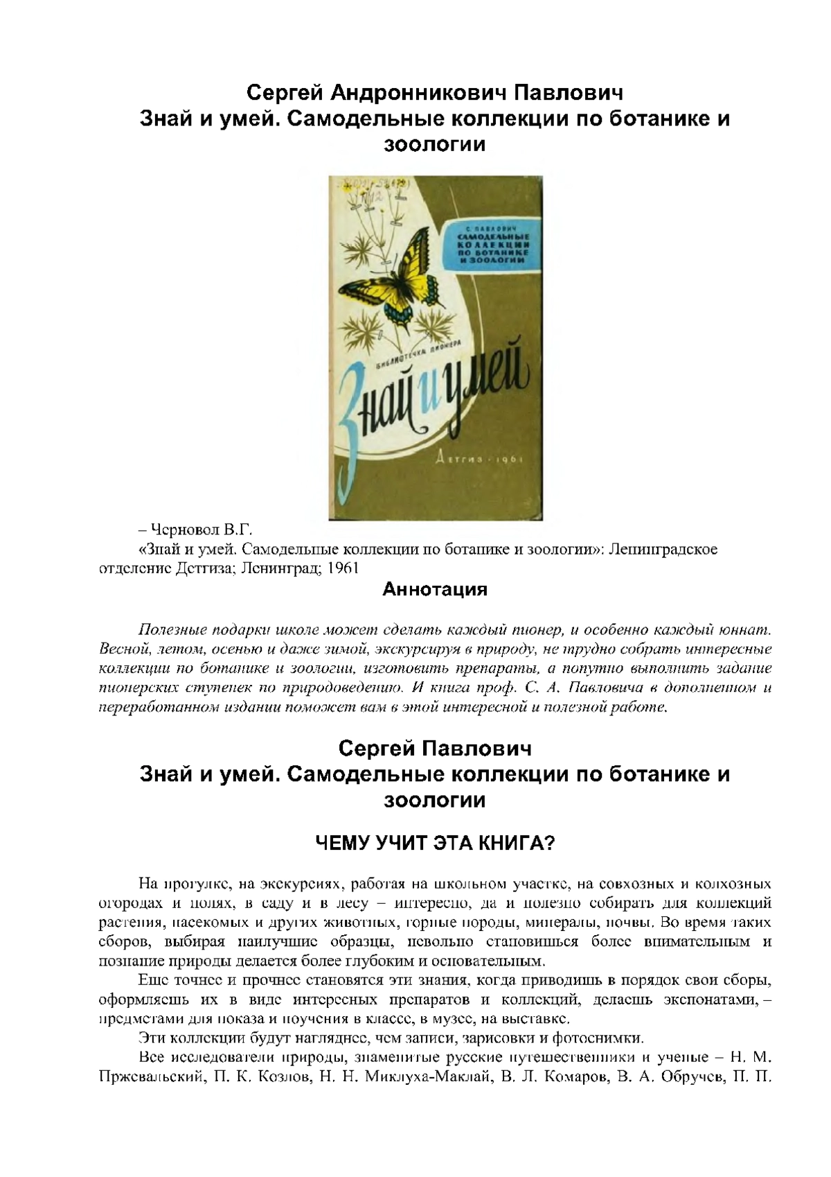 Полезные подарки к школе может сделать каждый пионер, и особенно каждый юннат. Весной, летом, осенью и даже зимой, экскурсируя на природу, не трудно собрать интересные коллекции по ботанике и зоологии, изготовить препараты, а попутно выполнить задание пионерских ступенек по природоведению. И книга проф. С. А. Павловича в дополненном и переработанном издании поможет вам в этой интересной и полезной работе.