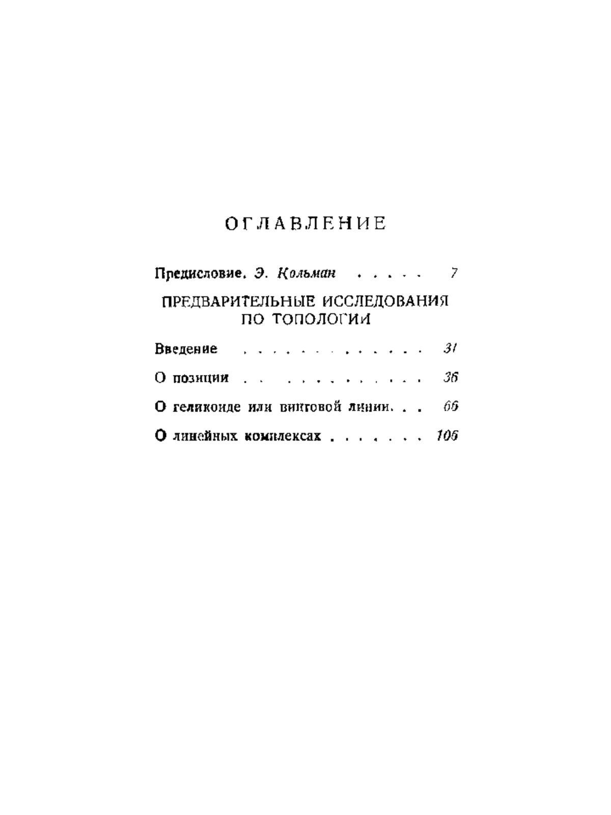 Основная идея топологии — это отвлечение от положения, величины и формы геометрических фигур: изучаются лишь те их свойства, которые сохраняются при одно-однозначных и непрерывных преобразованиях их; грубо выражаясь, те свойства, которые сохраняются в каучуковых моделях фигур (кривых, поверхностей, тел) при любой их деформации, не приводящей к разрыву или к склеиванию частей. Топологические очерки Листинга резко отличаются от всего того, что дала отрасль математики в своем последующем развитии. Современная топология далеко ушла от своих материальных корней, превратилась в одну из наиболее абстрактных из всех математических наук. Это развитие от чувственно-конкретного ко все большей и большей абстракции характерно для любого из отдельных отпочкований и в нем одновременно и сила и слабость математики как орудия научного познания материального мира. В данной книге собраны работы И. Б. Листинга по топологии.
