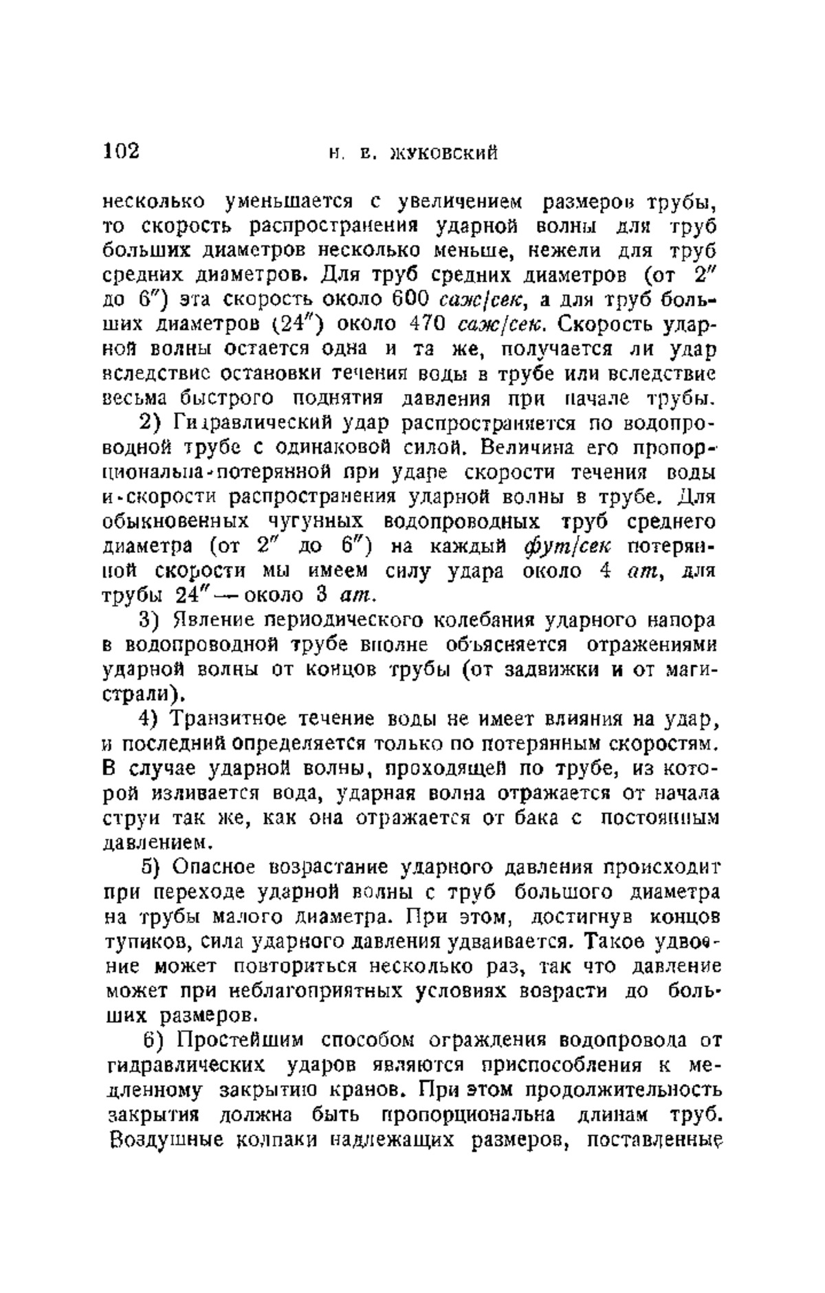 Работа Н. Е. Жуковского «О гидравлическом ударе в водопроводных трубах» представляет одно из наиболее замечательных исследований великого русского ученого. Эта работа, впервые напечатанная в «Бюллетенях Политехнического общества» (№ 5 за 1899 год) и немедленно переведенная на немецкий, английский и французский языки, создала Н. Е. Жуковскому славу мирового ученого в области гидромеханики еще задолго до тех его работ по авиации, которые положили основание современной аэродинамики и доставили ему имя «отца русской авиации». В своей работе Н. Е. Жуковский дает глубокое и очень полное теоретическое исследование вопроса о гидравлическом ударе в трубах и описывает многочисленные, необычайно широко поставленные опыты на московском водопроводе, всесторонне подтвердившие предложенную автором теорию. Все другие экспериментальные исследования, произведенные впоследствии, также подтвердили справедливость теории Н. Е. Жуковского, которая нашла теперь применение во всех отраслях техники.