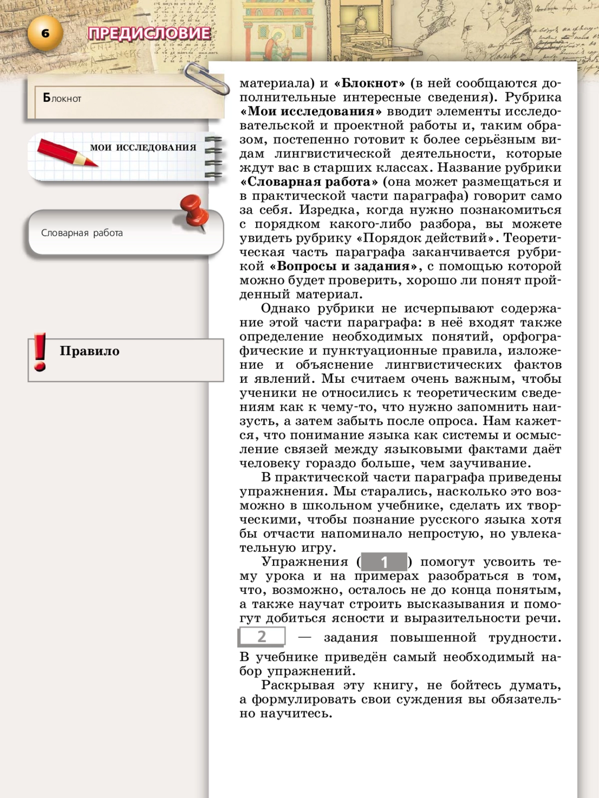 Учебник по русскому языку для шестиклассников – это как настоящая карта, которая помогает не просто разобраться в правилах, но и научиться выражать свои мысли чётко и красиво. Всё сделано так, чтобы темы, которые кажутся сложными, становились понятнее, и даже пунктуация не вызывала страха. А сколько внимания уделено нормам русского языка! Тут и орфография, и пунктуация, и даже стилистика – всё это подаётся легко и увлекательно. Мне особенно понравилась идея с заданиями-исследованиями и заметками на полях. Представьте, даже обычный урок превращается в увлекательное занятие, где ты не просто повторяешь грамматику, а вдумчиво разбираешься, как русский язык работает на практике. Это не монотонная зубрёжка, а возможность дополнительно обогатить словарный запас и узнать, как устроен текст и его стиль. А ещё тут акцент сделан на тексты из классической и современной литературы – всё выбрано с учётом возраста.