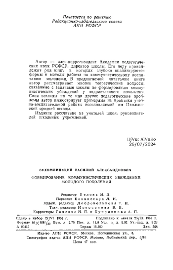 Автор - член-корреспондент Академии педагогических наук РСФСР, директор школы. Его перу принадлежит ряд книг, в которых глубоко анализируются формы и методы работы по коммунистическому воспитанию молодежи. В предлагаемой читателям книге автор рассматривает многие теоретические вопросы, связанные с задачами школы по формированию коммунистических убеждений у подрастающего поколения. Свои взгляды на те или другие педагогические проблемы автор иллюстрирует примерами из практики учебно-воспитательной работы возглавляемой им Павлышской средней школы. Издание рассчитано на учителей школ, руководителей школьных учреждений.