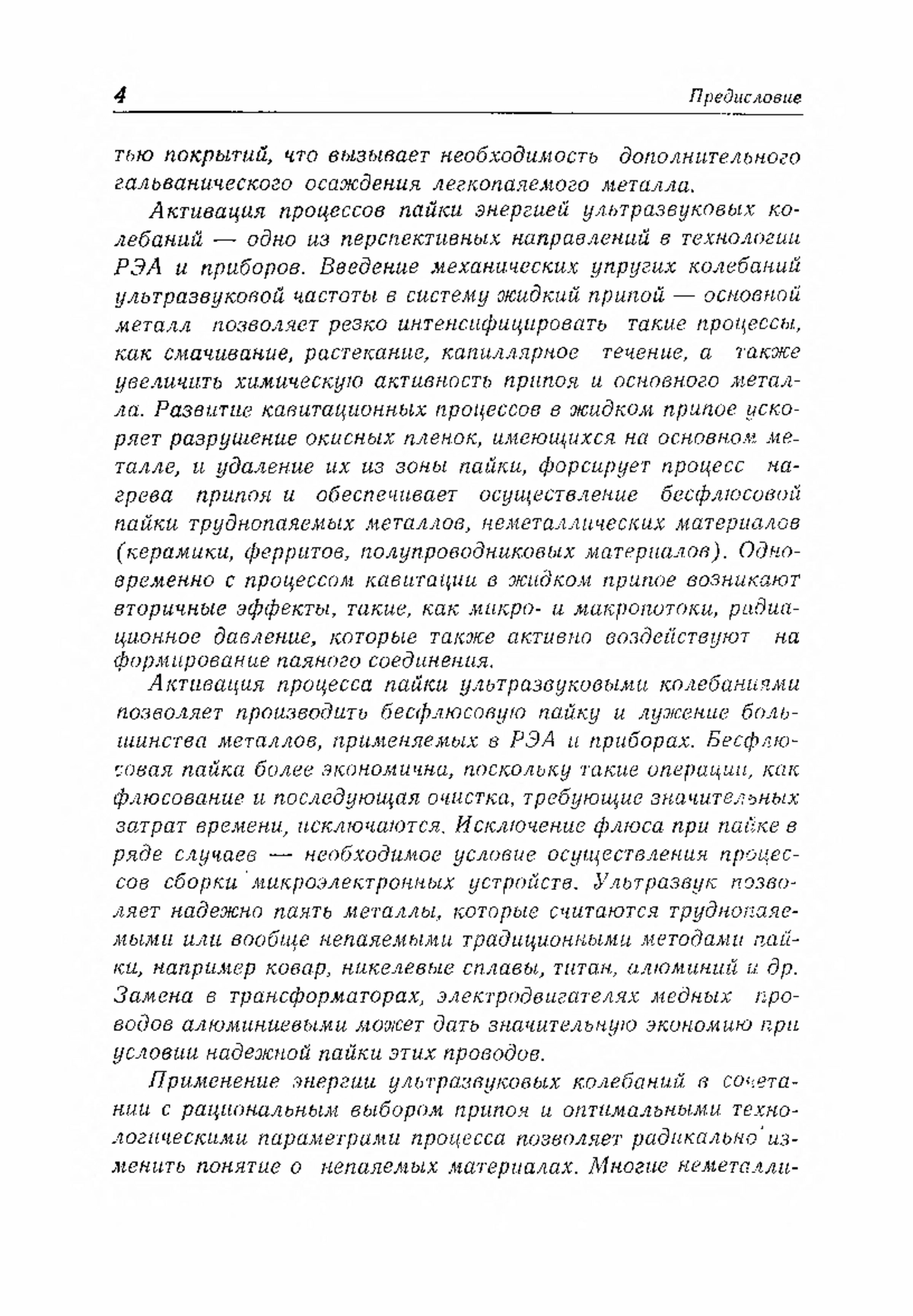 В книге обобщены результаты экспериментальных и теоретических исследований в области ультразвуковой пайки, применяемой в производстве радиоэлектронной аппаратуры и приборов. Описаны физико-химические процессы, возникающие при воздействии ультразвуковых колебаний на расплавы припоев. Дан анализ современных способов, технологического оснащения и материалов, обеспечивающих высокое качество спаев в ультразвуковом поле. Рассмотрено формирование качественных паяных соединений с металлическими и неметаллическими материалами. Анализируются вопросы влияния ультразвука на физико-механические свойства конструктивных элементов радиоаппаратуры и приборов, перспективы развития и промышленного освоения ультразвуковой пайки в связи с микроминиатюризацией РЭА и приборов. Рассчитана на научных и инженерно-технических работников, специализирующихся в области технологии радио- и приборостроения, может быть полезна преподавателям, аспирантам и студентам.