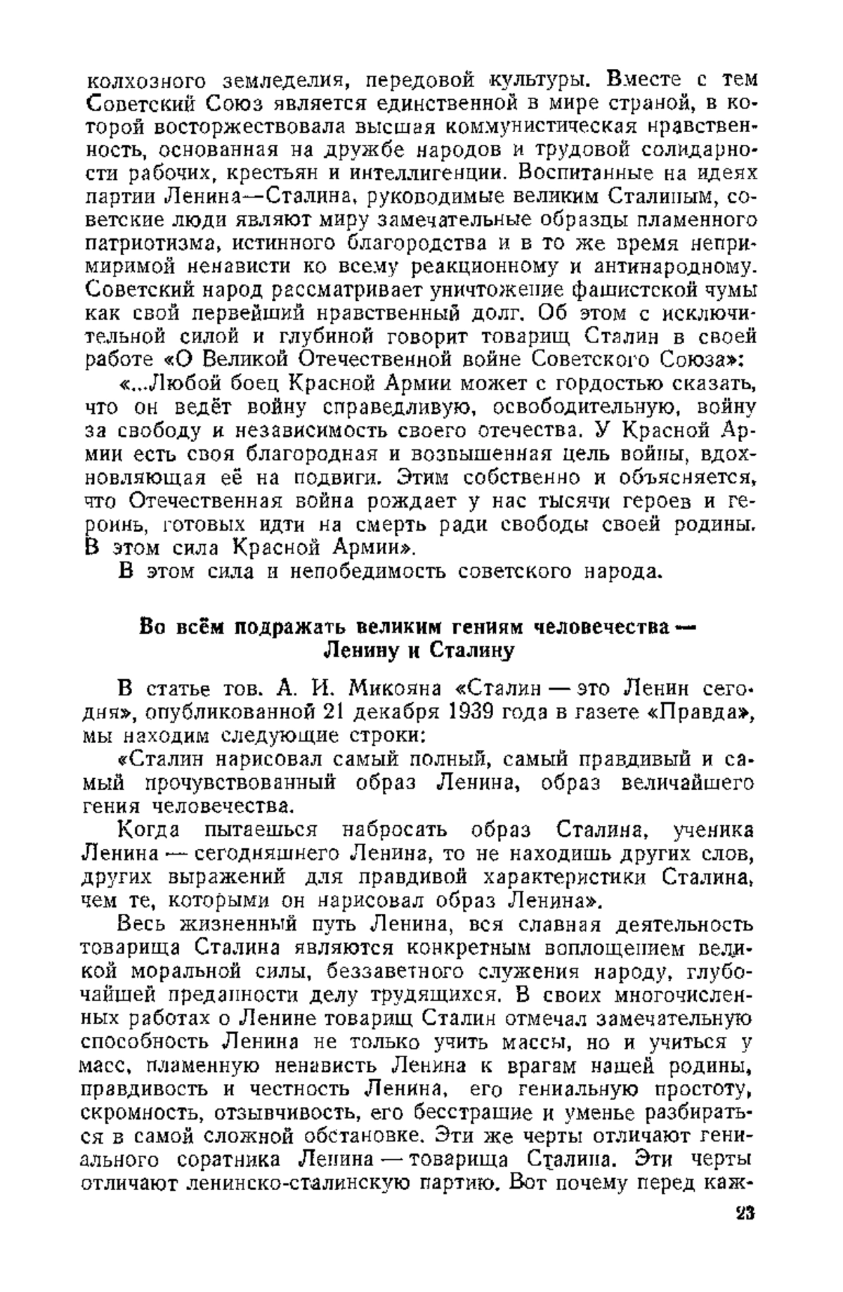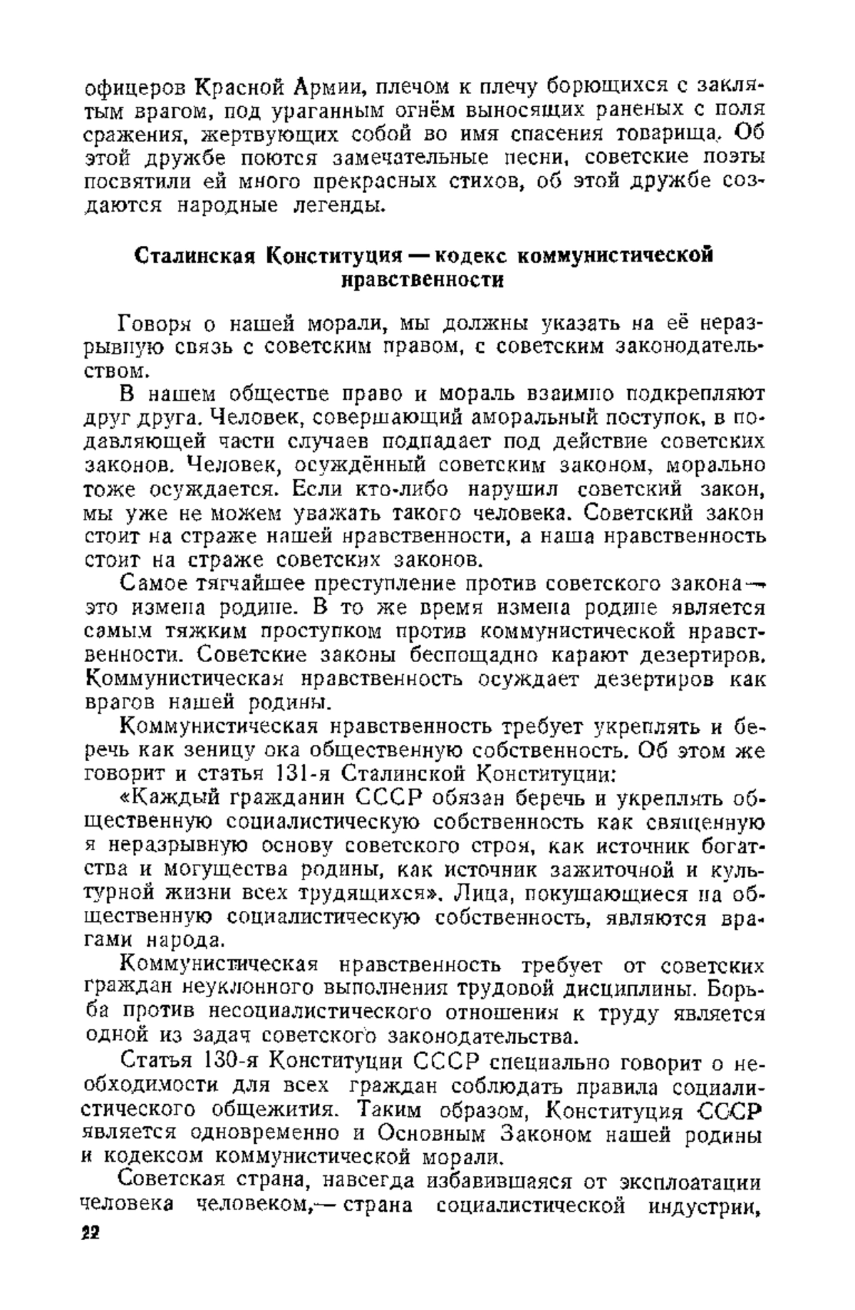 «Великая Отечественная война советского народа против немецко-фашистских захватчиков с исключительной силой выявила замечательные нравственные черты советского человека: горячий, животворный патриотизм, безграничную веру в торжество нашего правого дела, героизм, презрение к смерти, трудовой энтузиазм. Моральные достоинства советских людей приобрели значение могучего реального фактора. Ещё на XVIII съезде партии товарищ Сталин говорил о морально-политическом единстве народных масс Союза как об одной из основных движущих сил советского общества. В условиях Отечественной войны это морально-политическое единство ещё больше окрепло и превратилось в величайший фактор победы…»