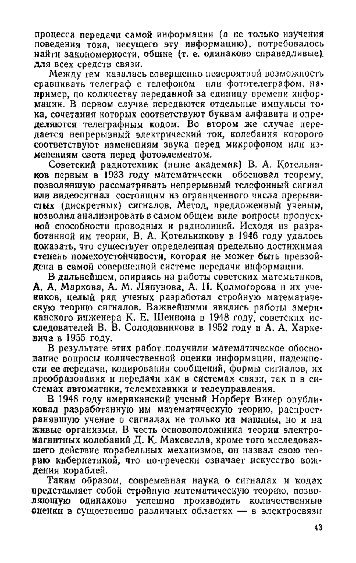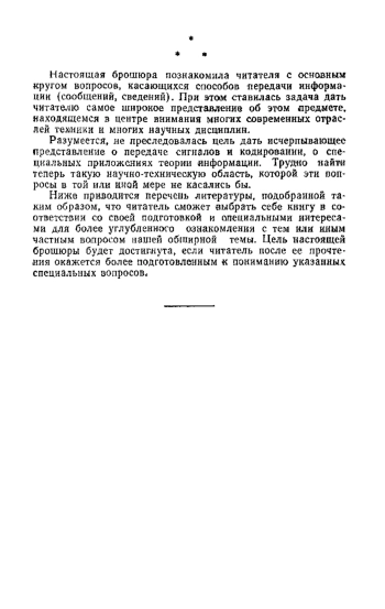 Настоящая брошюра знакомит читателя с основным кругом вопросов, касающихся способов передачи информации (сообщений, сведений). При этом ставилась задача дать читателю самое широкое представление об этом предмете, находящемся в центре внимания многих современных отраслей техники и многих научных дисциплин. Разумеется, не преследовалась цель дать исчерпывающее представление о передаче сигналов и кодировании, о специальных приложениях теории информации. Трудно найти теперь такую научно-техническую область, которой эти вопросы в той или иной мере не касались бы.