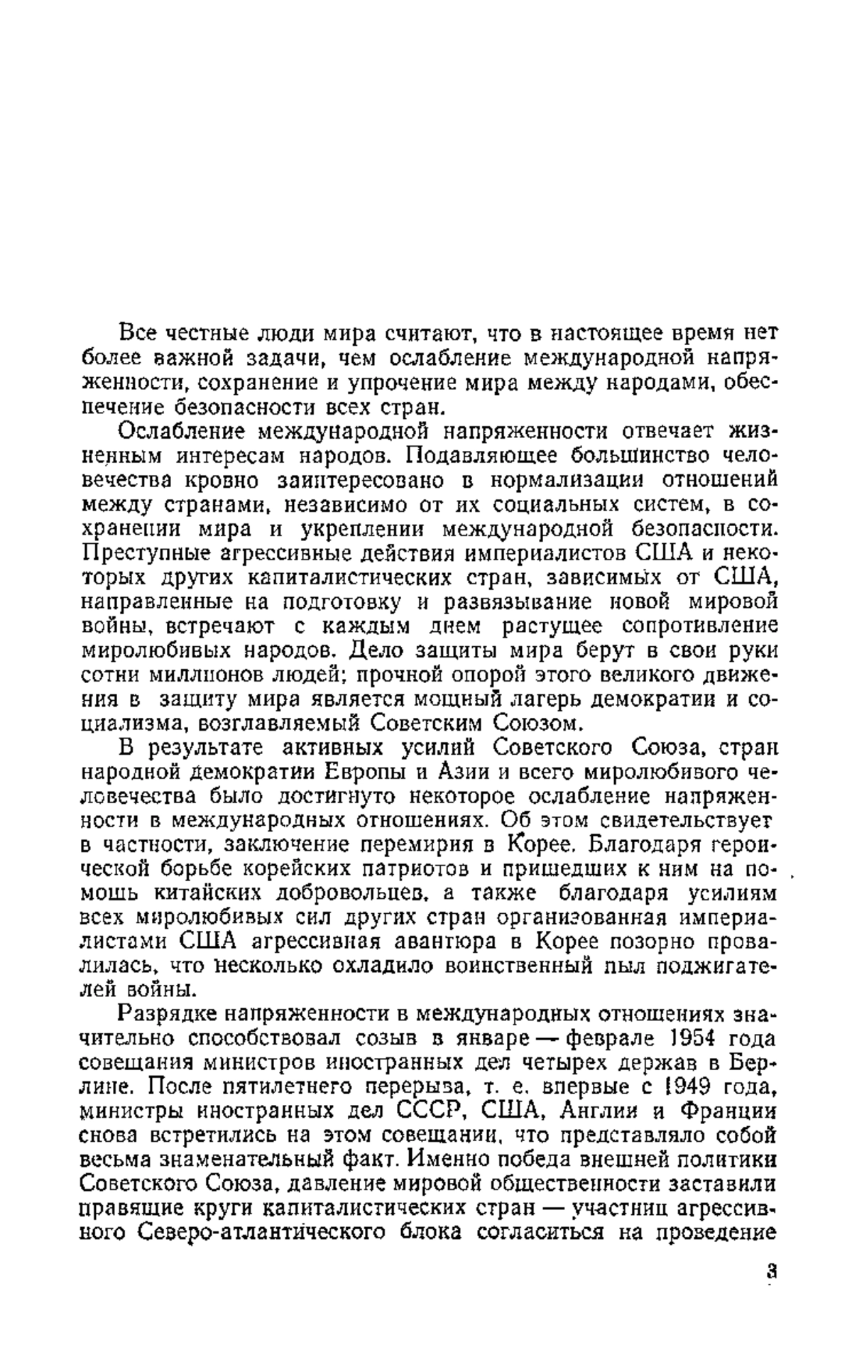«…Все честные люди мира считают, что в настоящее время нет более важной задачи, чем ослабление международной напряженности, сохранение и упрочение мира между народами, обеспечение безопасности всех стран. Ослабление международной напряженности отвечает жизненным интересам народов. Подавляющее большинство человечества кровно заинтересовано в нормализации отношений между странами, независимо от их социальных систем, в сохранении мира и укреплении международной безопасности. Преступные агрессивные действия империалистов США и некоторых других капиталистических стран, зависимых от США, направленные на подготовку и развязывание новой мировой войны, встречают с каждым днем растущее сопротивление миролюбивых народов…»