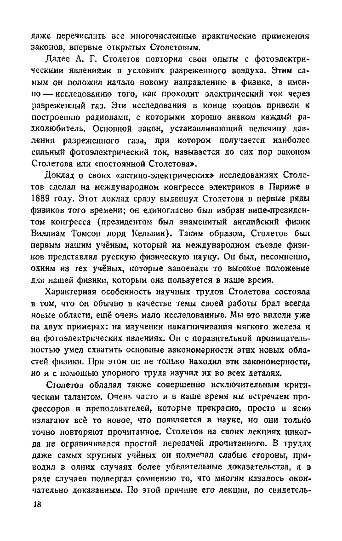 «Даже при самом беглом знакомстве с историей физики в нашей стране внимание невольно останавливается прежде всего на именах трёх замечательных русских физиков: Ломоносова, Столетова и Лебедева. С ними связаны не только блестящие научные исследования, оказавшие могучее влияние на дальнейшее развитие физики, как нашей, так и зарубежной, но также и представление о неутомимом и самоотверженном труде по созданию тех необходимых условий в нашем отечестве, при которых только и стало возможно развитие научной работы в области физики…»