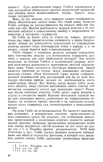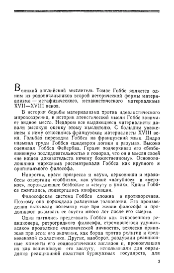 «Великий английский мыслитель Томас Гоббс является одним из родоначальников второй исторической формы материализма — метафизического, механистического материализма XVII—XVIII веков. В истории борьбы материализма против идеалистического мировоззрения, в истории атеистической мысли Гоббс занимает видное место. Недаром все выдающиеся материалисты давали высокую оценку этому мыслителю. С большим уважением к нему относились французские материалисты XVIII века…»