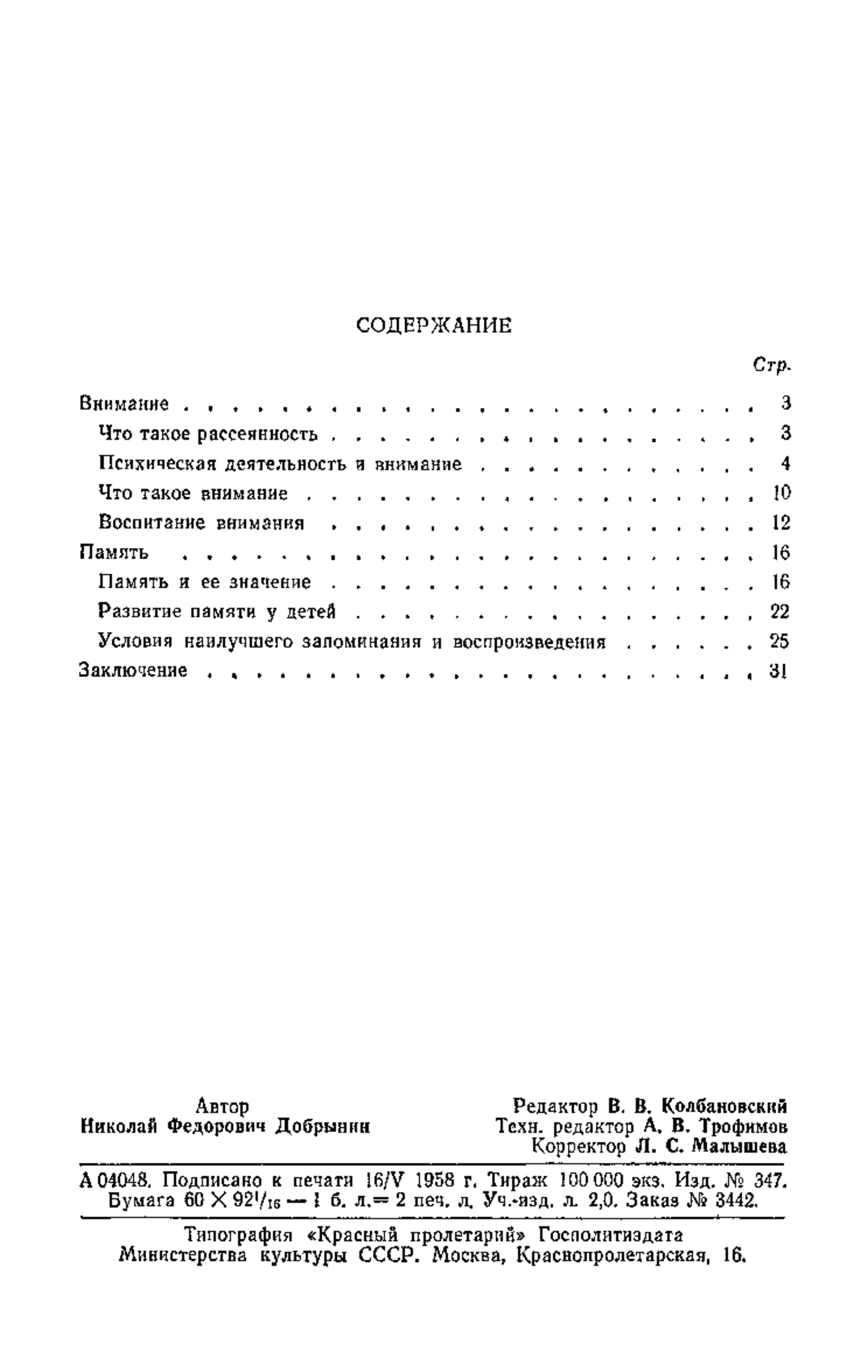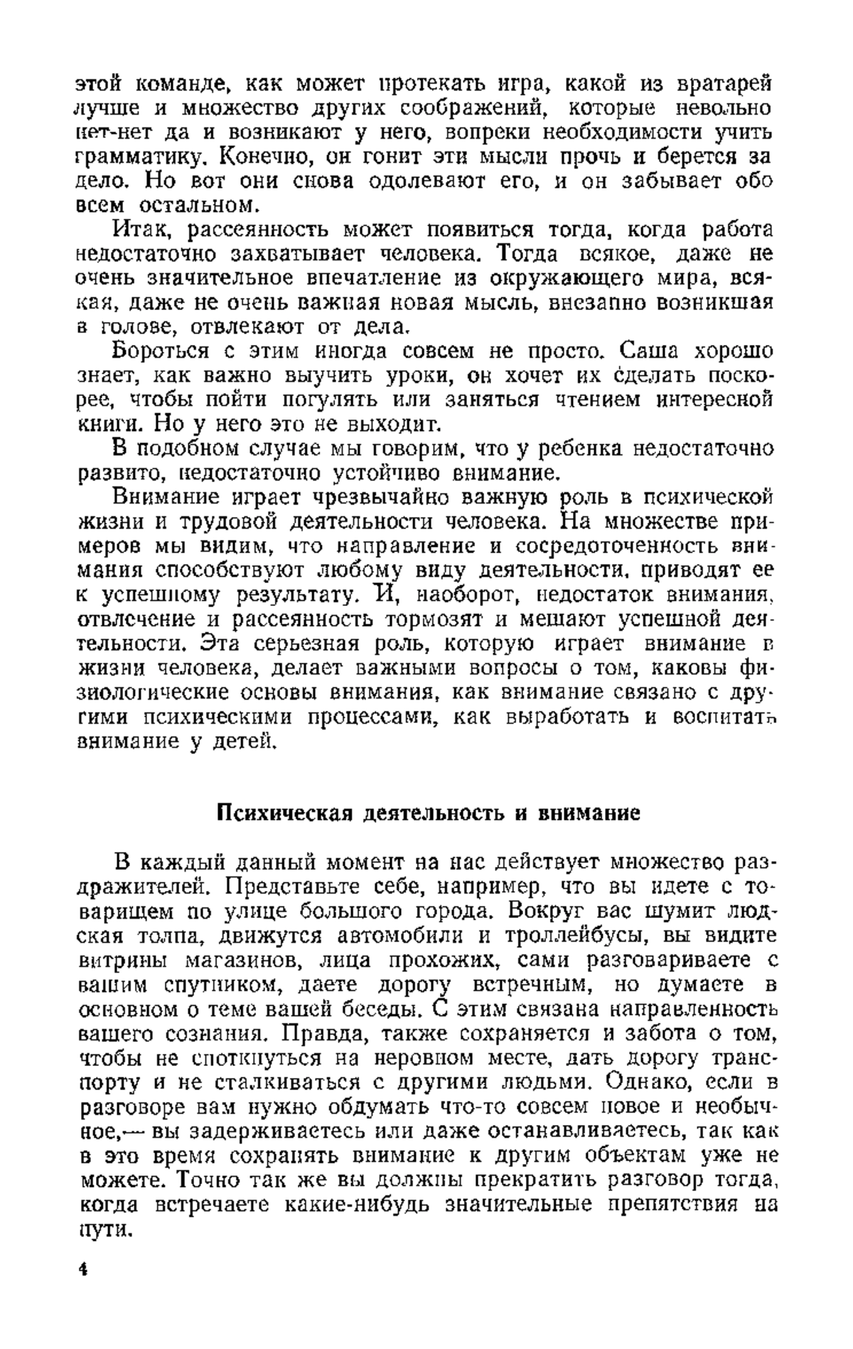 «Каждый замечал, что иногда никак не удается полностью и надолго заняться одной какой-нибудь работой, например, чтением трудно написанной книги. Прочитаешь несколько строк и начинаешь думать совсем о другом. Спохватываешься, снова берешься за чтение, но через несколько минут опять замечаешь, что отвлекся. Вот ученик 5-го класса Саша готовит дома уроки. Как будто бы все сделано домашними так, чтобы он не отвлекался: он сидит за отдельным столом, перед ним окно третьего этажа, вблизи крыши соседних домов, ничего интересного в окно не видно. Он старательно разложил книги, тетрадки и принимается читать учебник грамматики…»