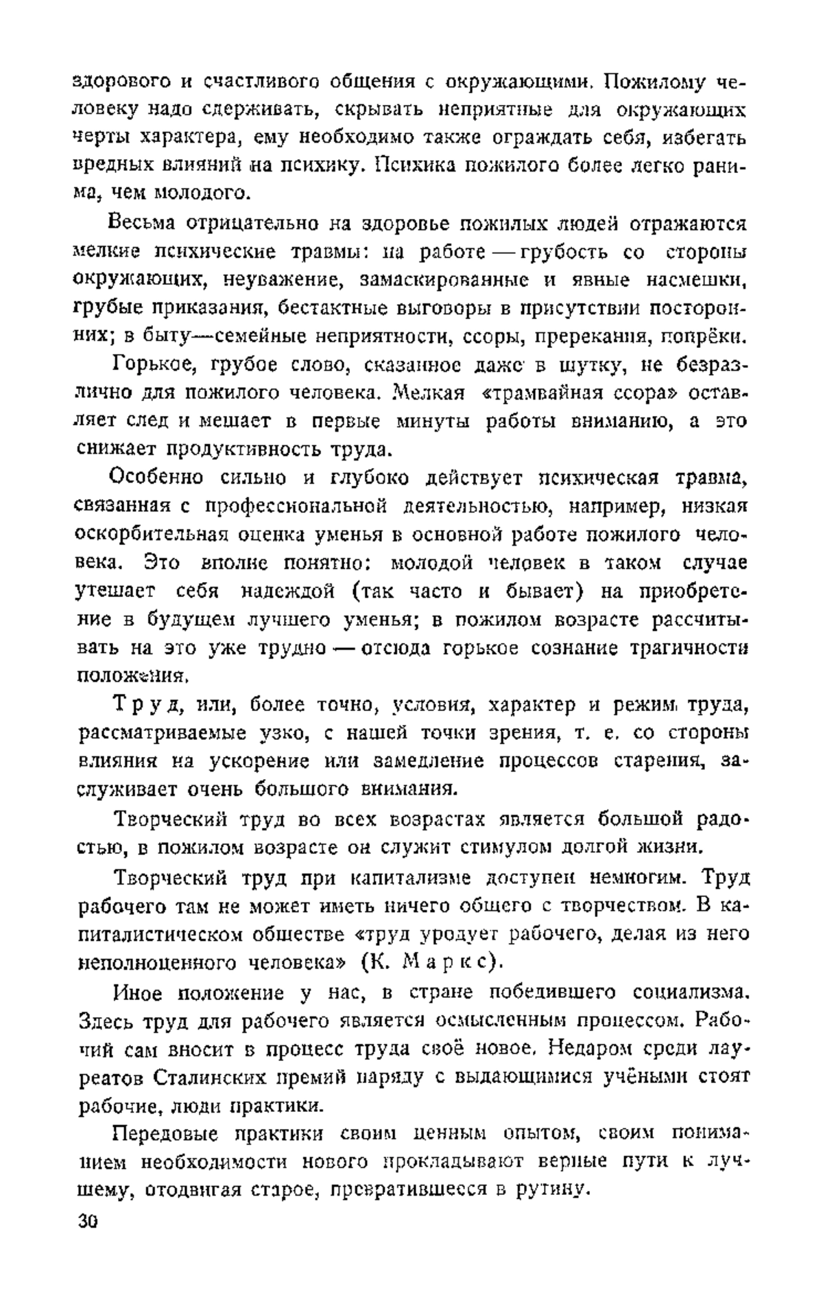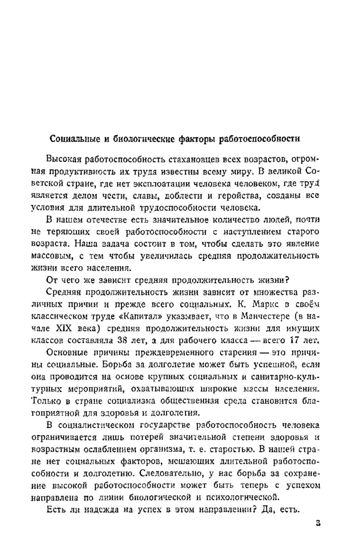 «Высокая работоспособность стахановцев всех возрастов, огромная продуктивность их труда известны всему миру. В великой Советской стране, где нет эксплоатации человека человеком, где труд является делом чести, славы, доблести и геройства, созданы все условия для длительной трудоспособности человека. В нашем отечестве есть значительное количество людей, почти не теряющих своей работоспособности с наступлением старого возраста. Наша задача состоит в том, чтобы сделать это явление массовым, с тем чтобы увеличилась средняя продолжительность жизни всего населения…»