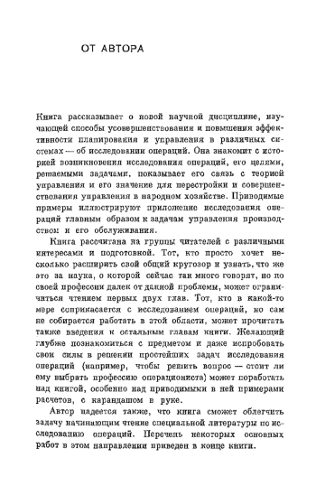 В книге рассказывается о новой научной дисциплине, изучающей способы усовершенствования и повышения эффективности планирования и управления в различных системах, - об исследовании операций. Автор знакомит с историей возникновения этой дисциплины, ее целями, решаемыми с ее помощью задачами, показывает ее значение для перестройки и совершенствования управления в народном хозяйстве. Книга рассчитана на широкий круг читателей - ученых и инженерно-технических работников смежных областей знаний, преподавателей и студентов естественно-технических вузов, всех, интересующихся современными проблемами науки. Книга является одной из серии научно-популярных книг, подготовленных учеными Института проблем управления (автоматики и телемеханики).