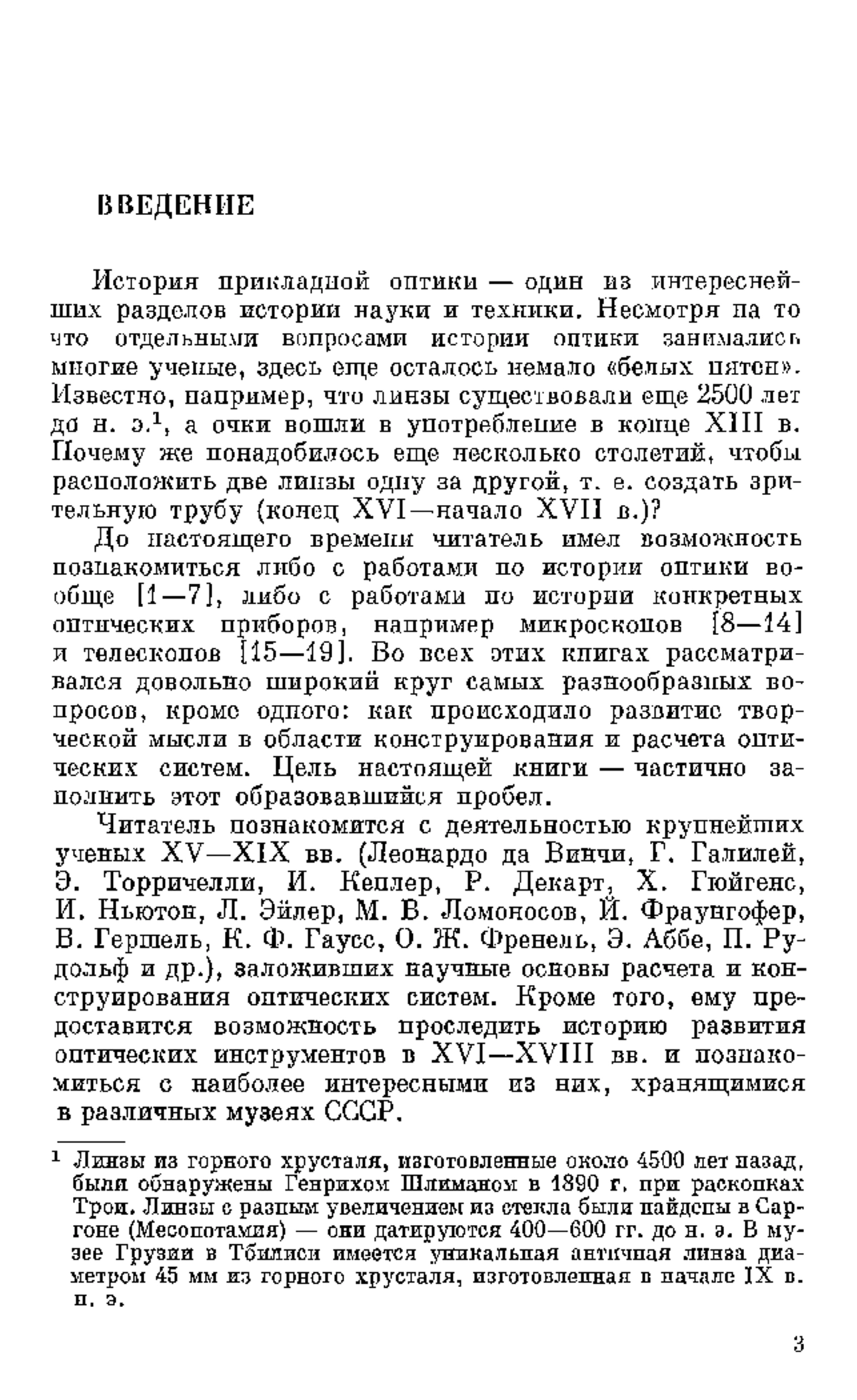 «История прикладной оптики — один из интереснейших разделов истории науки и техники. Несмотря на то что отдельными вопросами истории оптики занимались многие ученые, здесь еще осталось немало «белых пятен». Известно, например, что линзы существовали еще 2500 лет до н. э., а очки вошли в употребление в конце XIII в. Почему же понадобилось еще несколько столетий, чтобы расположить две линзы одну за другой, т. е. создать зрительную трубу (конец XVI—начало XVII в.)?…»