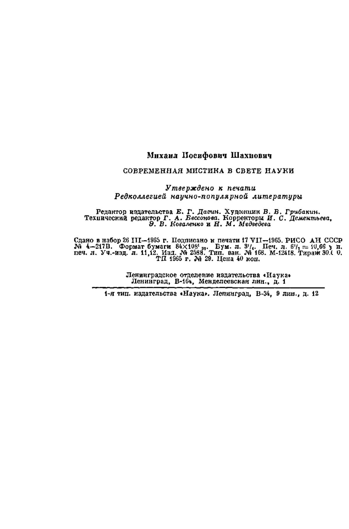 Профессор Ленинградского государственного университета, доктор философских наук Михаил Иосифович Шахнович, автор книг «Ленин и проблемы атеизма», «Гойя против папства и инквизиции», «От суеверий к науке», впервые в советской литературе освещает происхождение и реакционную сущность современной вневероисповедной мистики. Разоблачая на большом фактическом материале теорию и практику астрологов, спиритов, теософов, антропософов, радиэстезистов и тому подобных шарлатанов, которые гримируют мистицизм под науку, автор рассказывает о прогрессивных ученых, борющихся в капиталистических странах против воскрешения средневековой магии под новым названием оккультизма. В заключительной главе говорится о необходимости полного преодоления любых пережитков мистицизма в Советском Союзе.