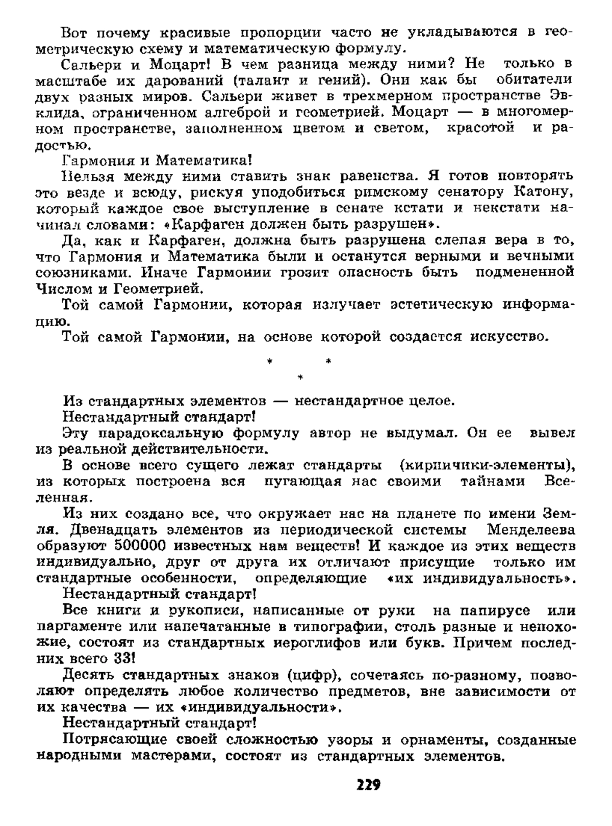 «… Возьмите наугад любую вещь, и она окажется стандартной. Авторучка, которой писались эти строки, изготовлена по стандарту, бумага стандартна, чернила — их состав, качество — также регламентированы стандартом. Оглянитесь вокруг. Комната наполнена стандартными вещами. Телевизор, радиоприемник, электрическая лампочка, недавно купленая мебель, да и сама комната в новом доме, и сам дом — все это соответствует определенным стандартам. И только старый дедовский шкаф напоминает о том, что так было не всегда…»