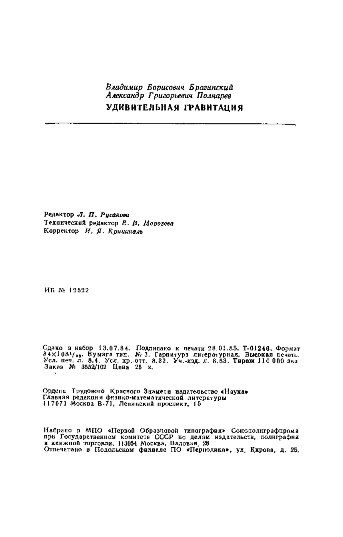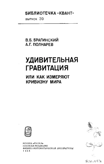 Брагинский В. Б., Полнарев А. Г. Удивительная гравитация (или как измеряют кривизну мира).— М.: Наука. Главная редакция физико-математической литературы, 1985.— 160 с.—(Библиотечка «Квант». Вып. 39.)—25 к.
