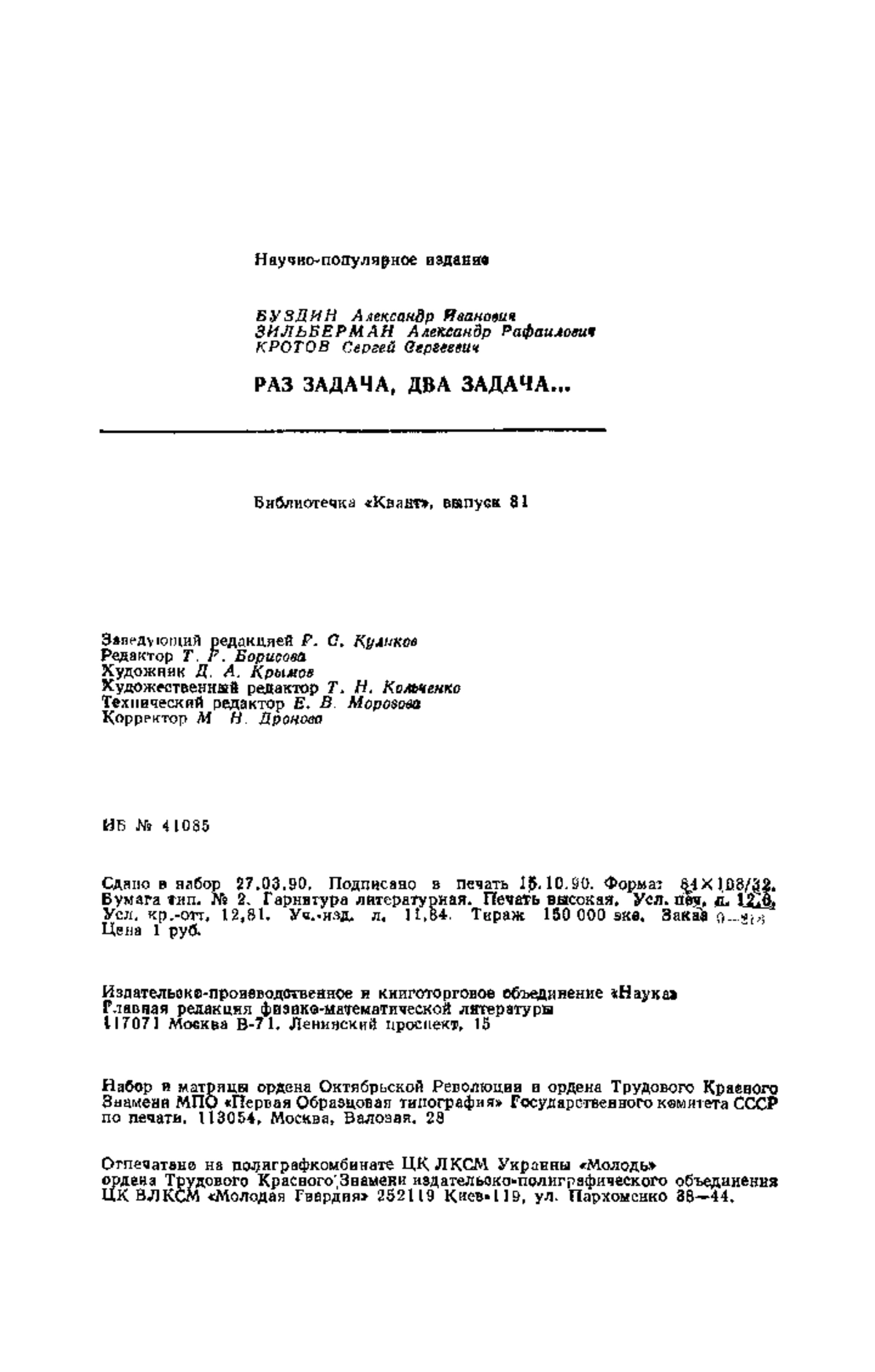 Буздин А. И., Зильберман А. Р., Кротов С. С. Раз задача, два задача… — М.: Наука. Гл. ред. физ.-мат. лит., 1990.—240 с. («Б-чка «Квант»; Вып. 81)