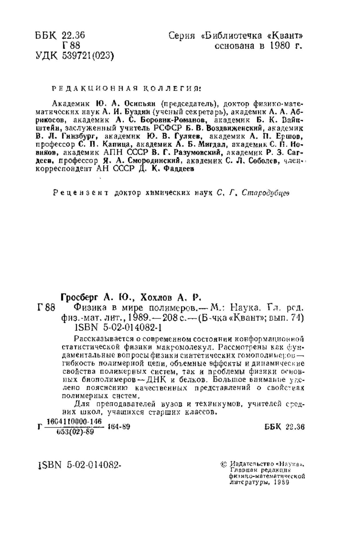 Гросберг А. Ю., Хохлов А. Р Физика в мире полимеров.— М.: Наука. Гл. ред. физ.-мат. лит., 1989.— 208 с
