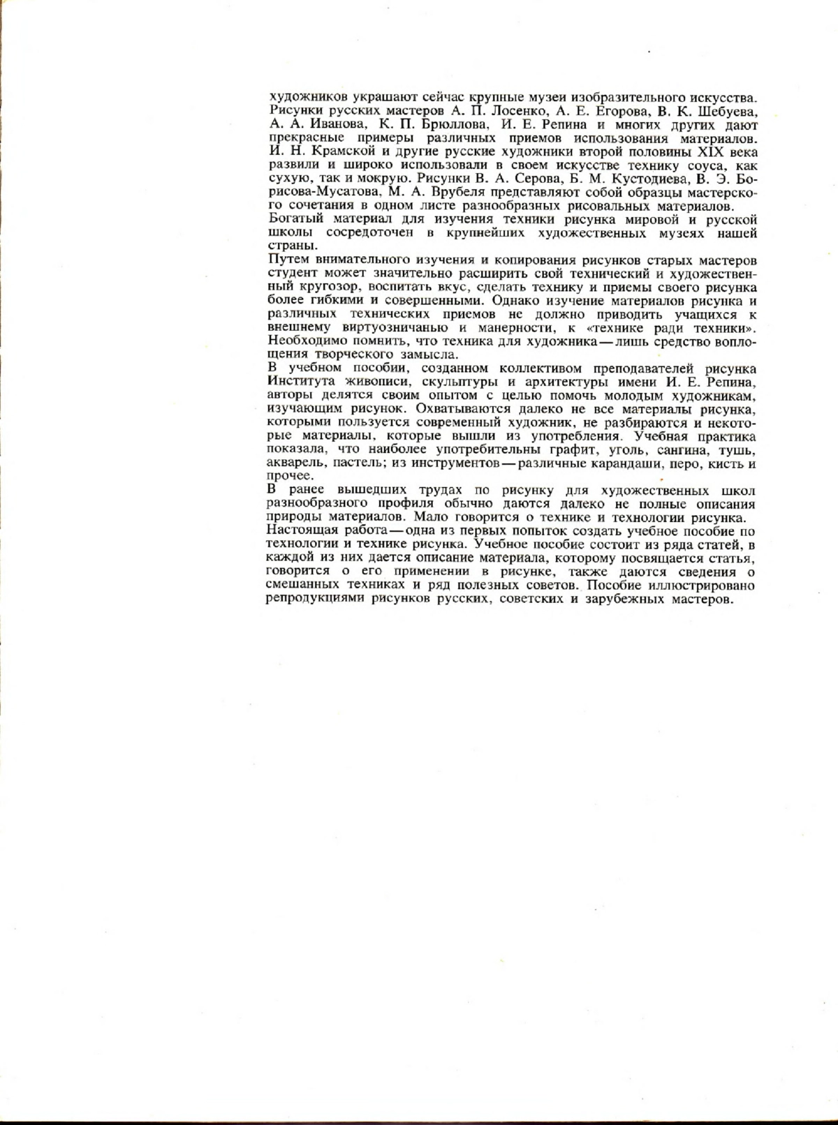 Учебное пособие, подготовленное Институтом живописи, скульптуры и архитектуры им. И. Е. Репина Академии Художеств знакомит читателей с различными графическими материалами (графит, сангина, уголь, перо, кисть, соус, пастель) и их использованием в процессе обучения рисунку. Пособие иллюстрировано лучшими образцами рисунков К. Брюллова, В. Серова, И. Репина, М. Врубеля, С. Герасимова, Н. Андреева, М. Нестерова, Тинторетто, Тициана, Рембрандта и других. Для учащихся высших учебных художественных заведений.