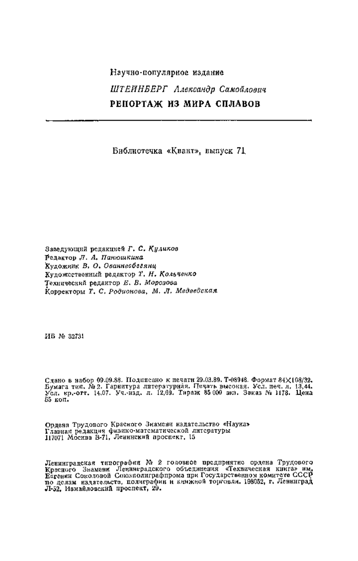 Штейнберг А. С. Репортаж из мира сплавов.— М.: Наука, Гл. ред. физ.-мат. лит., 1989.— 256 с.— (Б-чка «Квант»; Вып. 71)
