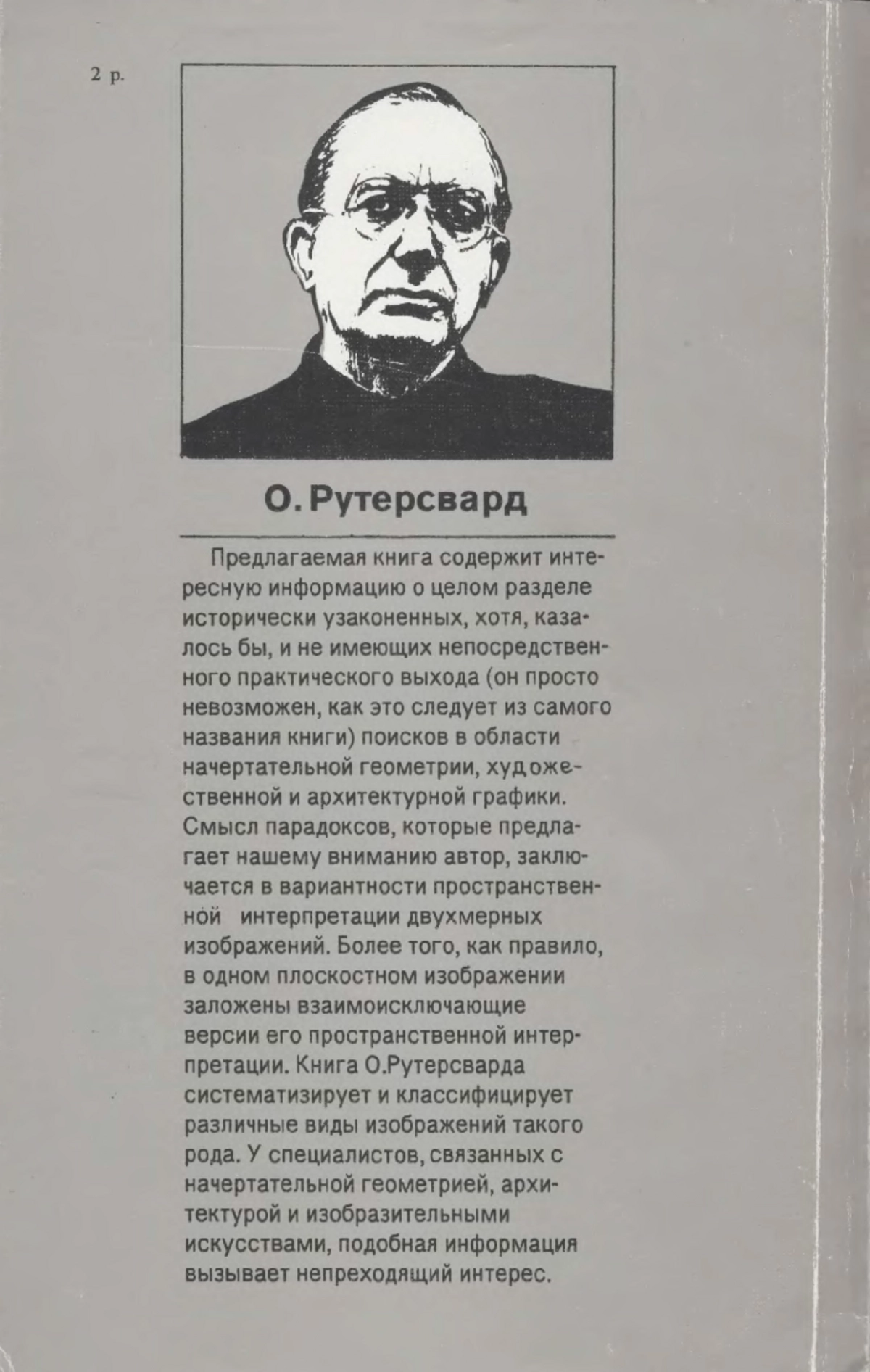 Книга шведского архитектора содержит изображения оригинальных авторских рисунков, на первый взгляд не имеющих практического применения. Смысл парадоксов, предлагаемых читателю, заключается в вариантности пространственной интерпретации двухмерных изображений. В издании систематизируются и классифицируются различные виды изображений такого рода. Книга, без сомнения, способствует не только профессиональному осмыслению начертательной геометрии и архитектуры, но и развитию пространственного мышления человека. Книга для архитекторов, студентов архитектурных вузов и широкого круга читателей.