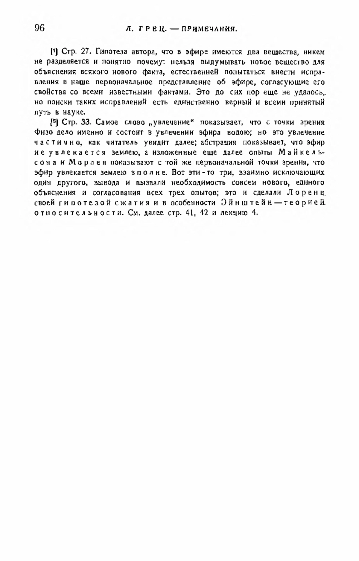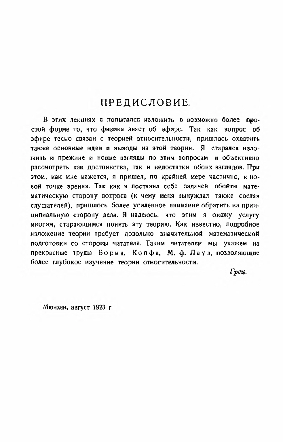 «… В этих лекциях я попытался изложить в возможно более простой форме то, что физика знает об эфире. Так как вопрос об эфире тесно связан с теорией относительности, пришлось охватить также основные идеи и выводы из этой теории. Я старался изложить и прежние и новые взгляды по этим вопросам и объективно рассмотреть как достоинства, так и недостатки обоих взглядов. При этом, как мне кажется, я пришел, по крайней мере частично, к новой точке зрения. Так как я поставил себе задачей обойти математическую сторону вопроса (к чему меня вынуждал также состав слушателей), пришлось более усиленное внимание обратить на принципиальную сторону дела…»