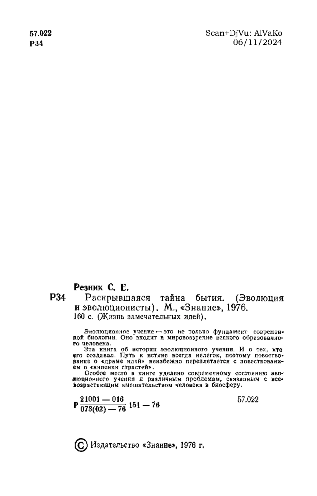 Раскрывшаяся тайна бытия. бытия. (Эволюция и эволюционисты). М., «Знание», 1976. 160 с. (Жизнь замечательных идей).