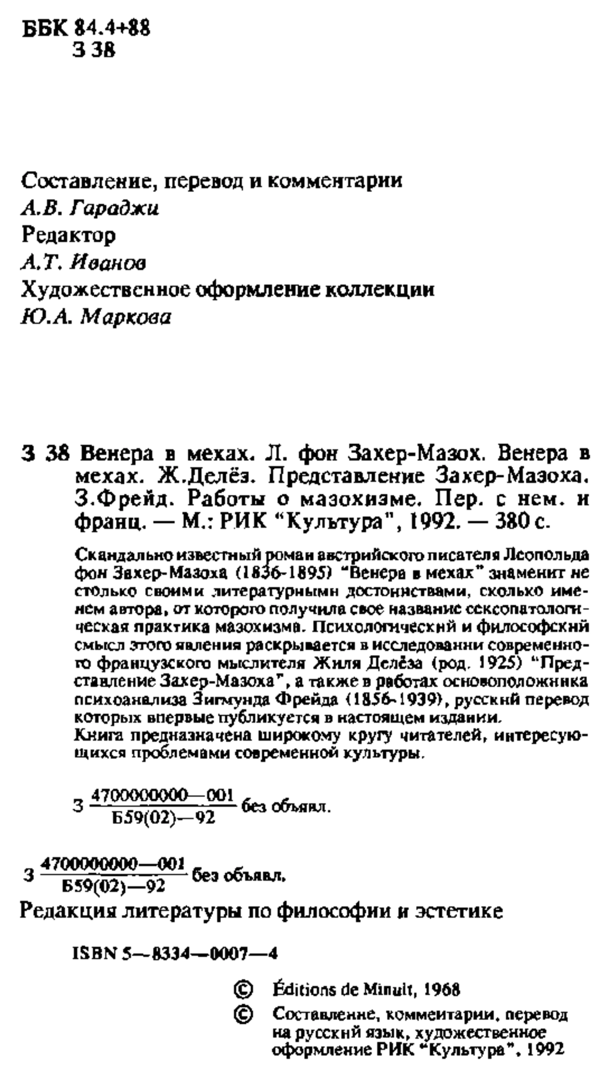 Венера в мехах. Л. фон Захер-Мазох. Венера в мехах. Ж.Делёз. Представление Захер-Мазоха. 3.Фрейд. Работы о мазохизме. Пер. с нем. и франц. — М.: РИК “Культура”, 1992. — 380 с.