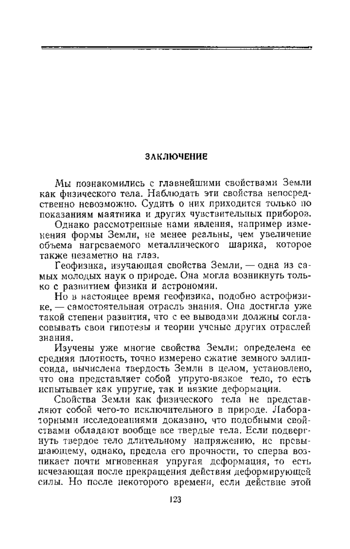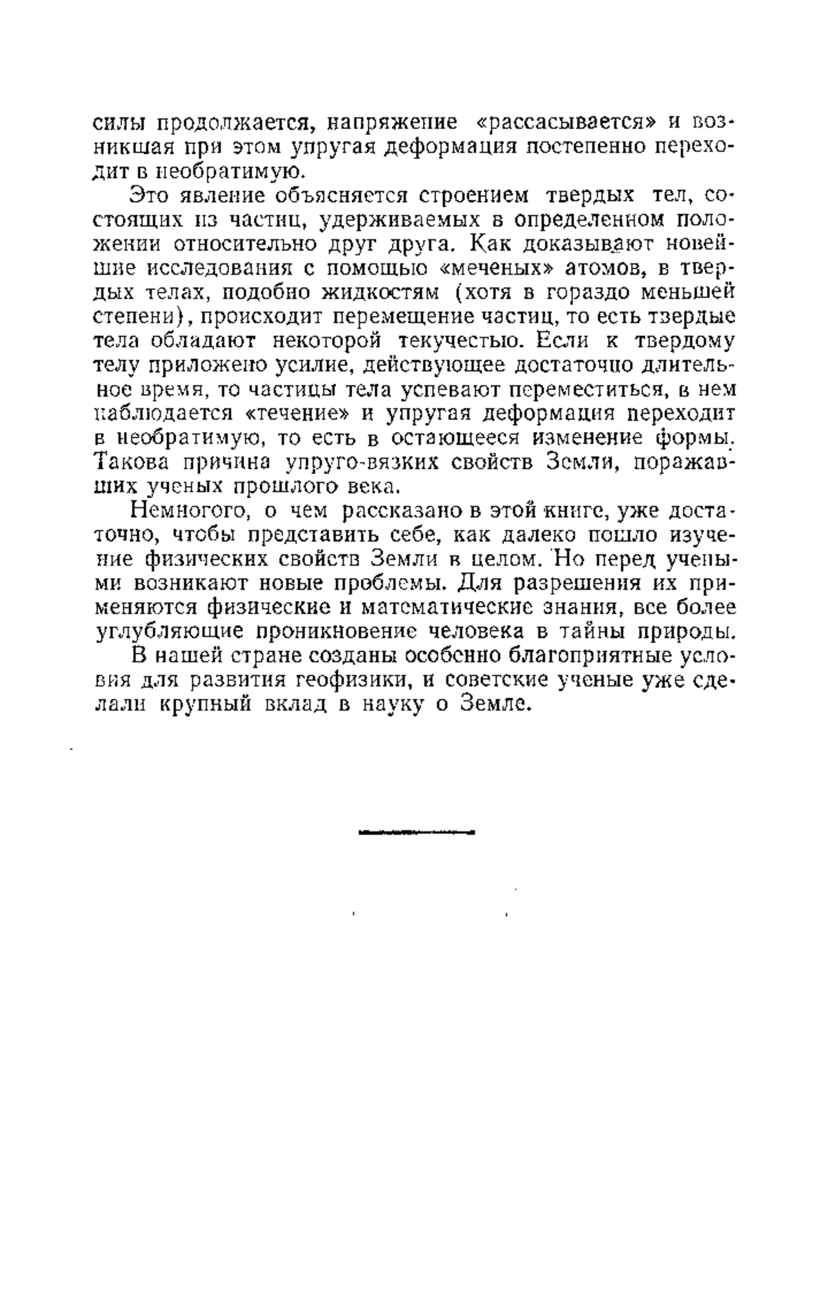 «…Свойства Земли как физического тела не представляют собой чего-то исключительного в природе. Лабораторными исследованиями доказано, что подобными свойствами обладают вообще все твердые тела. Если подвергнуть твердое тело длительному напряжению, не превышающему, однако, предела его прочности, то сперва возникает почти мгновенная упругая деформация, то есть исчезающая после прекращения действия деформирующей силы. Но после некоторого времени, если действие этой силы продолжается, напряжение «рассасывается» и возникшая при этом упругая деформация постепенно переходит в необратимую…»
