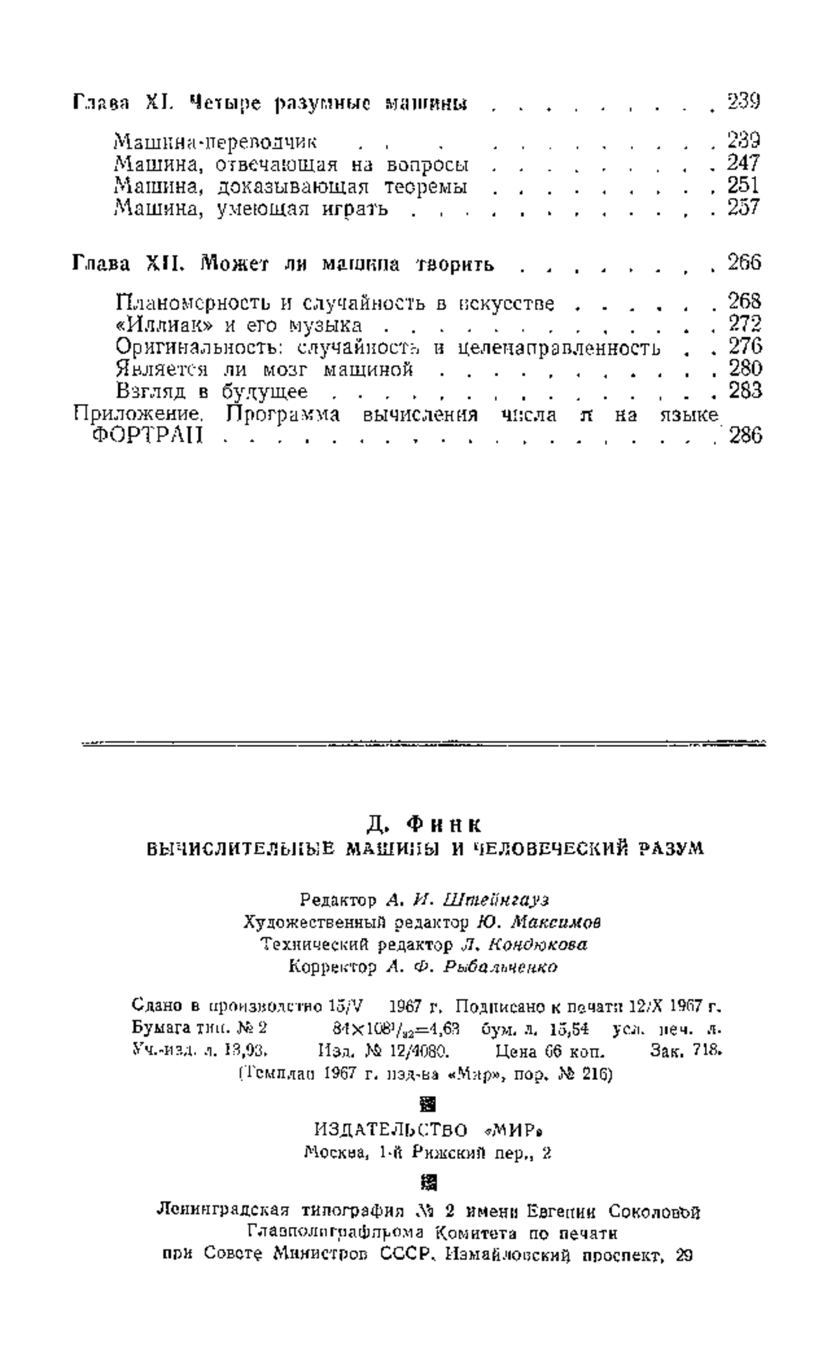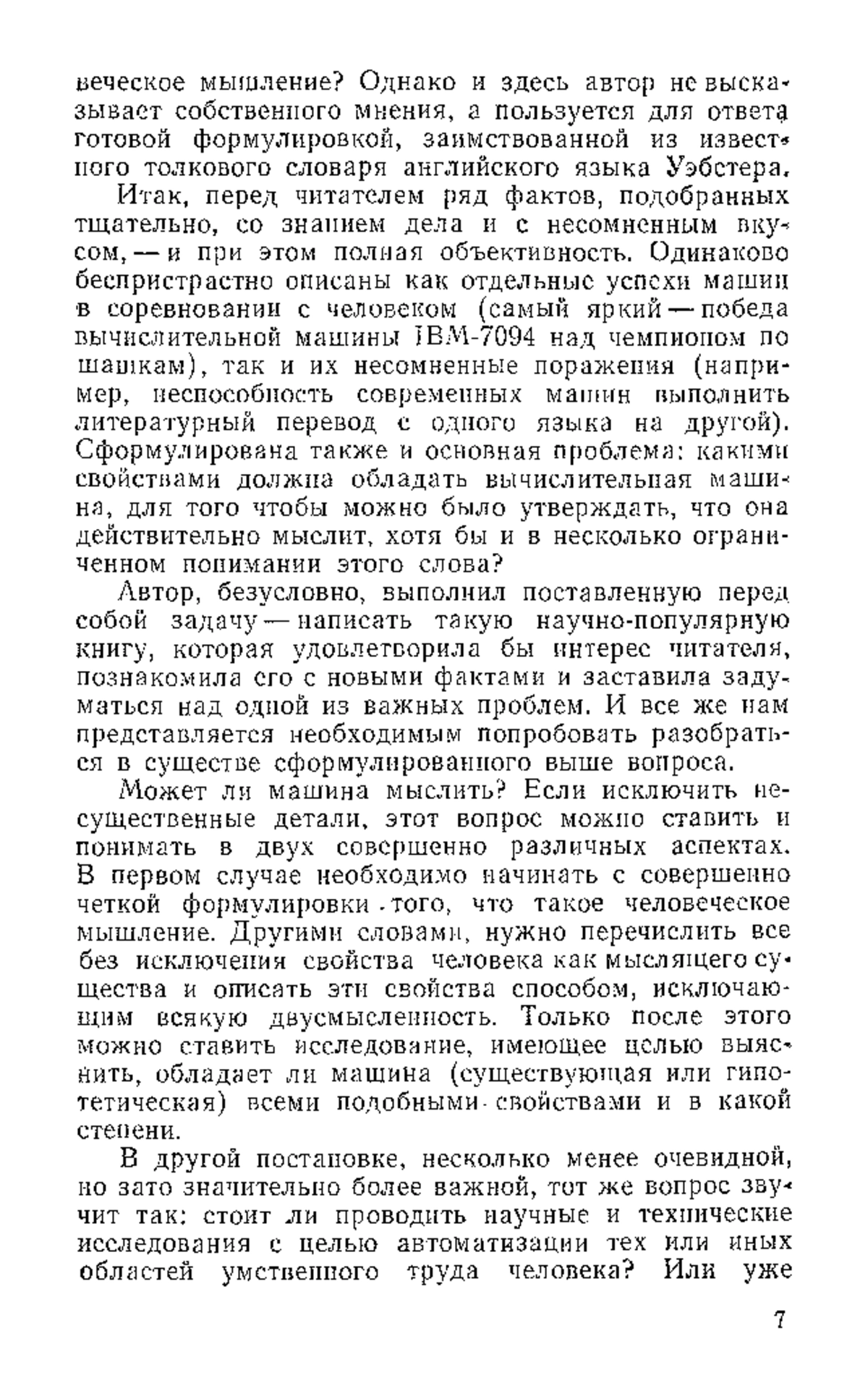 В наши дни, наверное, нет таких людей, которые ничего не слышали бы об электронных вычислительных машинах, о их роли в науке, технике, экономике. Но далеко не все ясно представляют себе принципы действия этих замечательных машин, их истинные возможности. Эта книга, не требуя от читателей какой-либо специальной подготовки, ясно и популярно рассказывает об основных принципах действия вычислительных машин и программирования; знакомит с некоторыми экспериментальными машинами и программами. Этим, однако, не исчерпывается содержание книги. Вторая часть ее посвящена сопоставлению мозга и вычислительной машины, человеческого и искусственного разума. Автор тщательно и подробно рассматривает все гипотезы и факты, что позволит читателю достаточно полно познакомиться с современным состоянием проблемы, которая коротко формулируется в виде вопроса: «Может ли машина мыслить?».