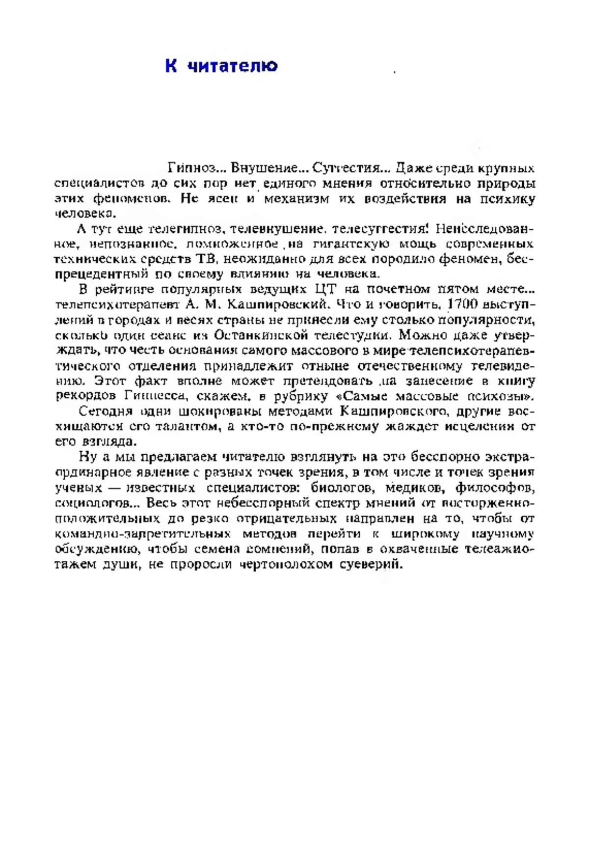 О враче-психотерапевте А. М. Кашпировском говорят буквально все. Кто он — новоявленный мессия, удивляющий чудесами легковерных и умело посрамляющий недоверчивых? Или первооткрыватель нового направления в психотерапии? В чем состоит его феномен и что больше от его выступлений — пользы или вреда?