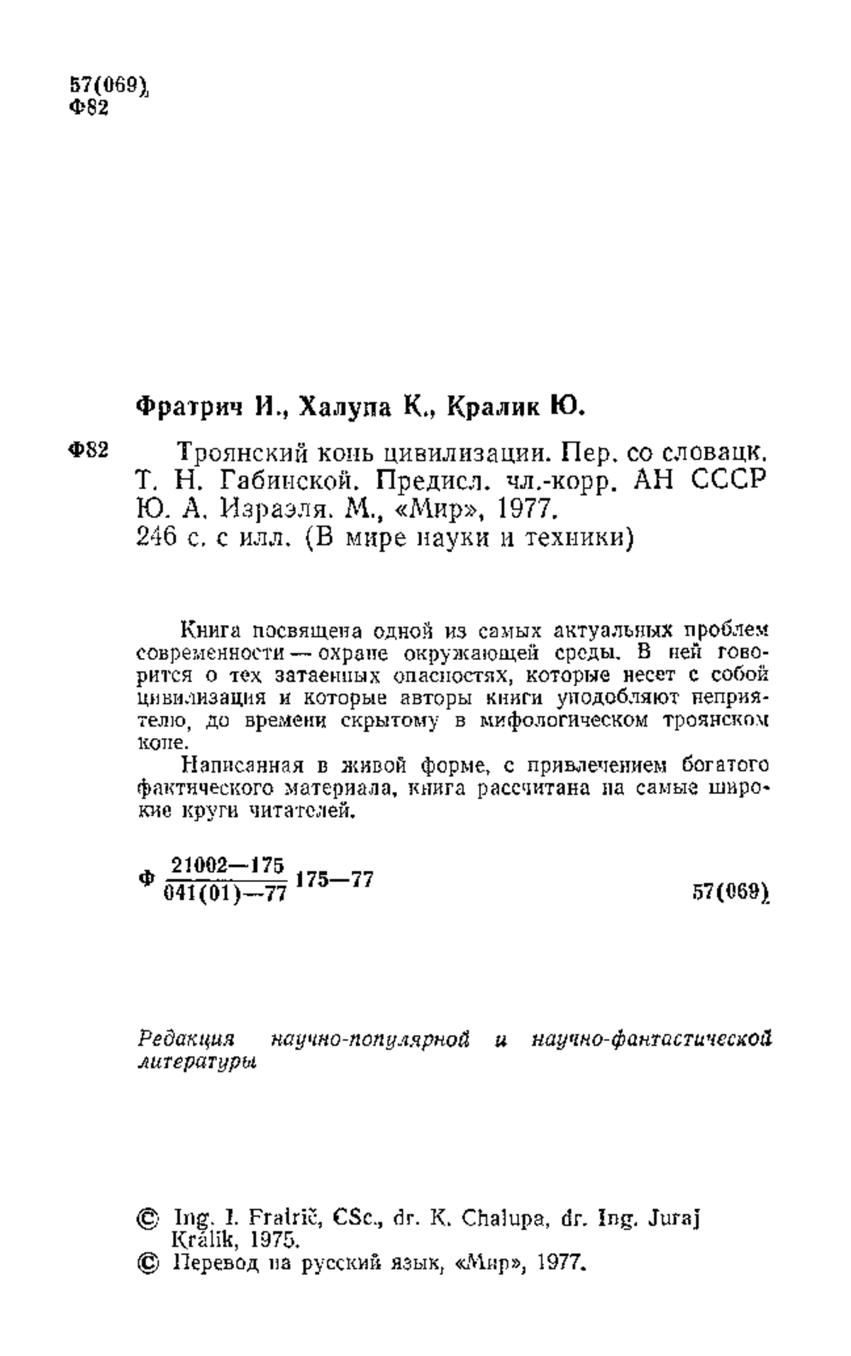 Фратрич И., Халупа К., Кралик Ю. Троянский конь цивилизации. Пер. со словацк. Т. Н. Габинской. Предисл. чл.-корр. АН СССР Ю. А. Израэля. М., «Мир», 1977. 246 с. с илл. (В мире науки и техники)