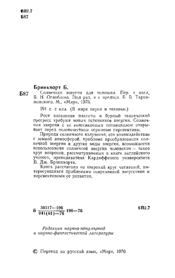 Солнечная энергия для человека. Пер. с англ. В. Н. Оглоблева. Под ред. и с предисл. Б В Тарни- жевского. М., «Мир», 1976.