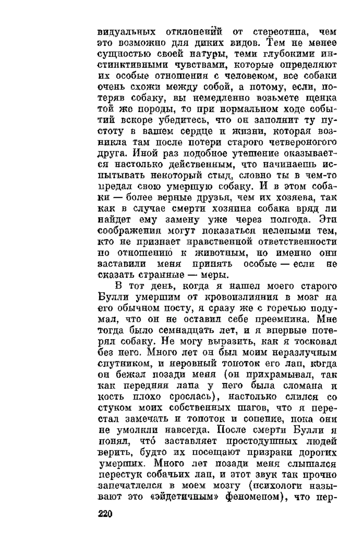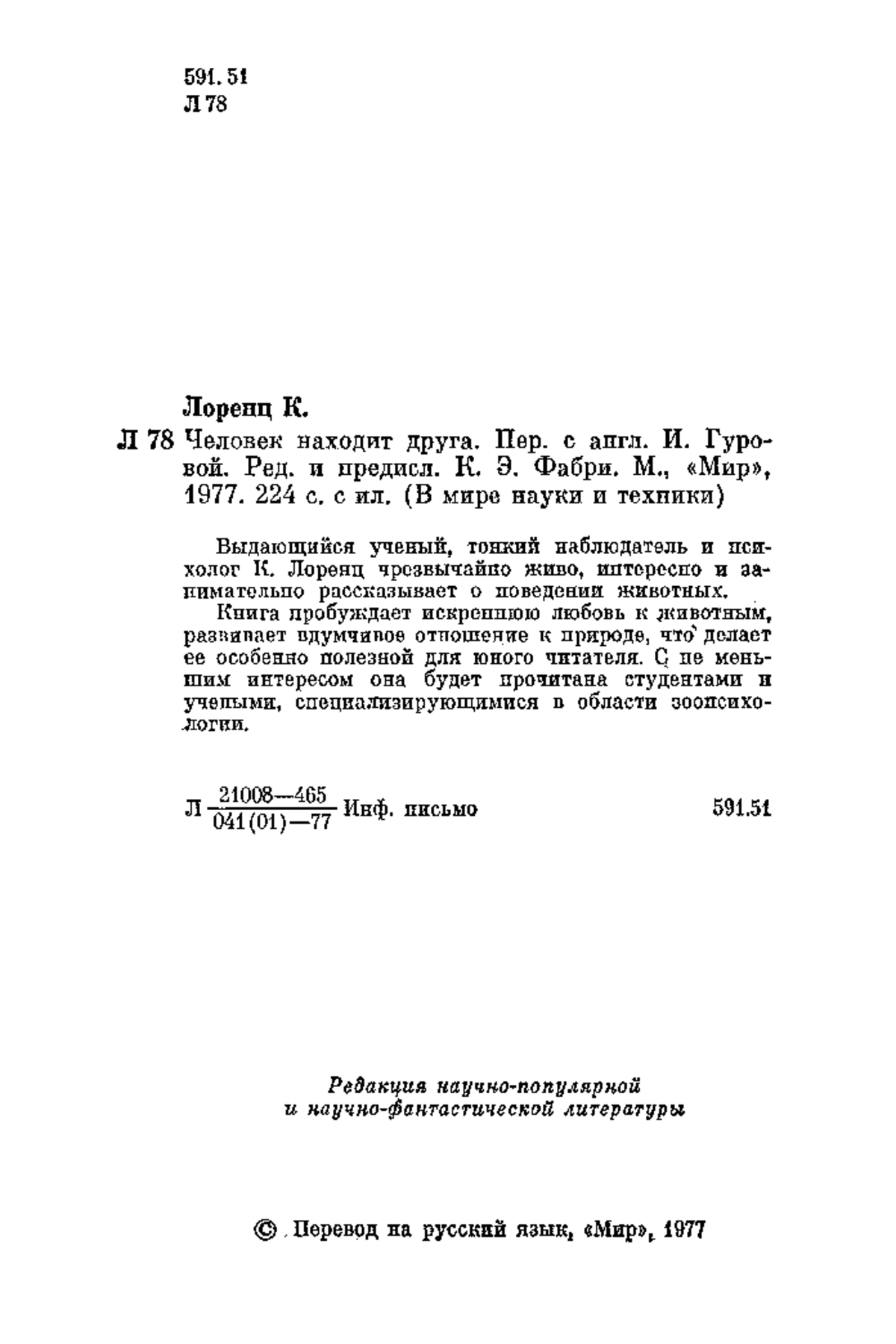 Выдающийся ученый, тонкий наблюдатель и психолог К. Лоренц чрезвычайно живо, интересно и занимательно рассказывает о поведении животных. Книга пробуждает искреннюю любовь к животным, развивает вдумчивое отношение к природе, что делает ее особенно полезной для юного читателя. С не меньшим интересом она будет прочитана студентами и учеными, специализирующимися в области зоопсихологии. Со времени первого издания книги на русском языке наука о поведении животных обогатилась новыми достижениями, а ее автору вместе с двумя другими крупнейшими исследователями в этой области, Н. Тинбергеном и К. Фришем, присуждена Нобелевская премия. За эти годы в Советском Союзе вышло несколько книг о поведении животных, но, пожалуй, ни в одной из них основные концепции этологии не излагаются столь популярно и доходчиво, как в этой книге.