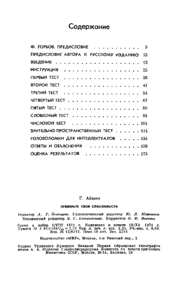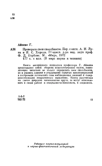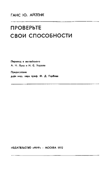 Проверьте свои способности. Пер. сангл. А. Н. Лука и И. С. Хорола. Птедисл. д-ра мед. наук проф. Ф. Д. Горбова. М., «Мир», 1972 477 с. с илл. (В мире науки и техники)