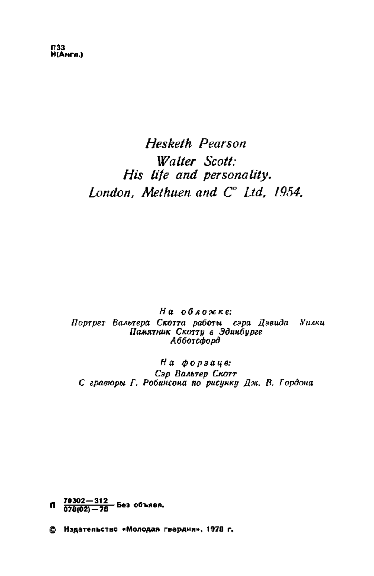 Вальтер Скотт. Пер. с англ., предисл. и коммент. В. Скороденко. - М.: Мол. гвардия, 1978. — 303 с., ил. -(Жизнь замечат. людей. Серия биогр. Вып. 16 (568).