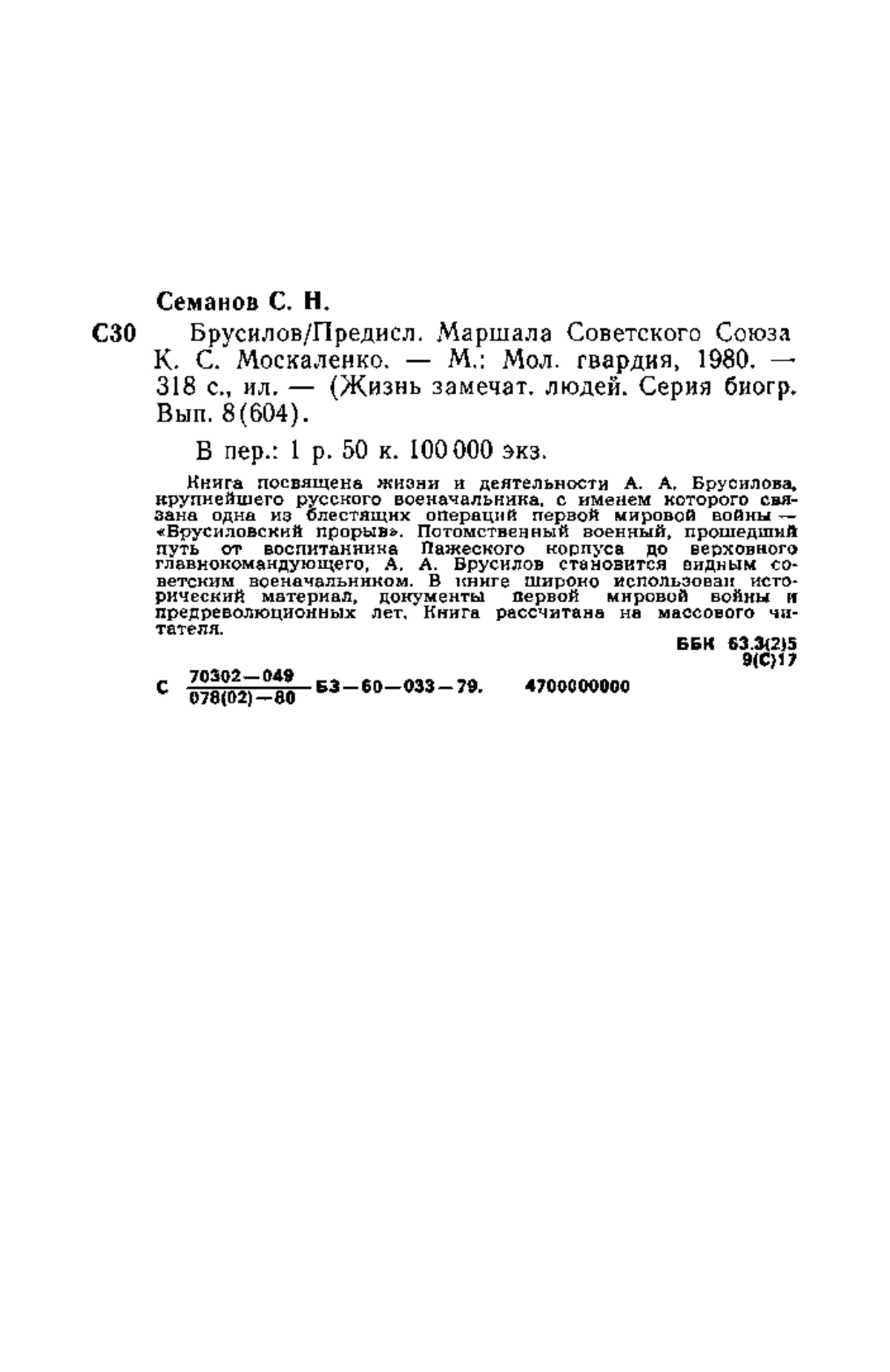 С З0 Брусилов/Предисл. Маршала Советского Союза К. С. Москаленко. — М.: Мол. гвардия, 1980. — 318 с., ил. — (Жизнь замечат. людей. Серия биогр. Вып. 8(604).