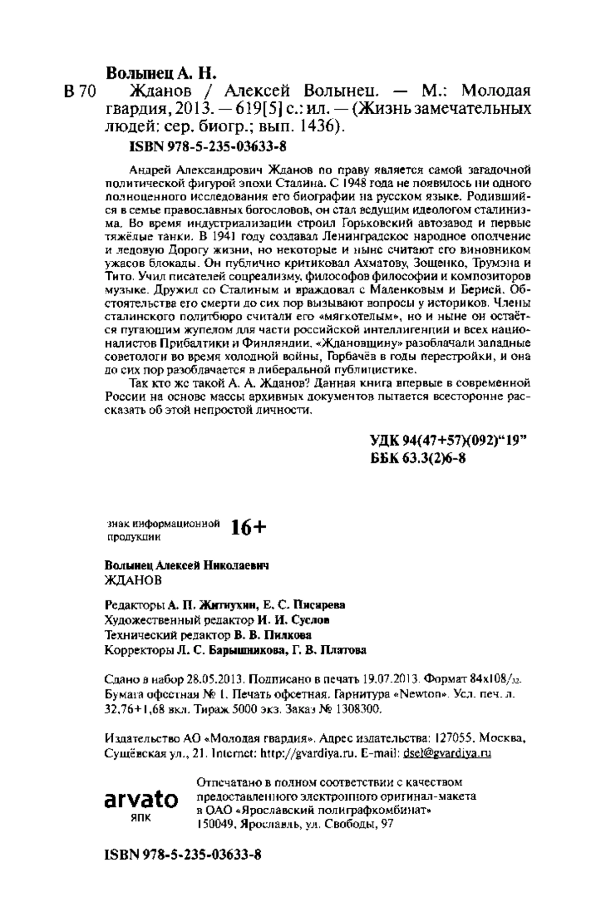 В 70 Жданов / Алексей Волынец. — М.: Молодая гвардия, 2013. — 619[5] с.: ил. — (Жизнь замечательных людей: сер. биогр.; вып. 1436).