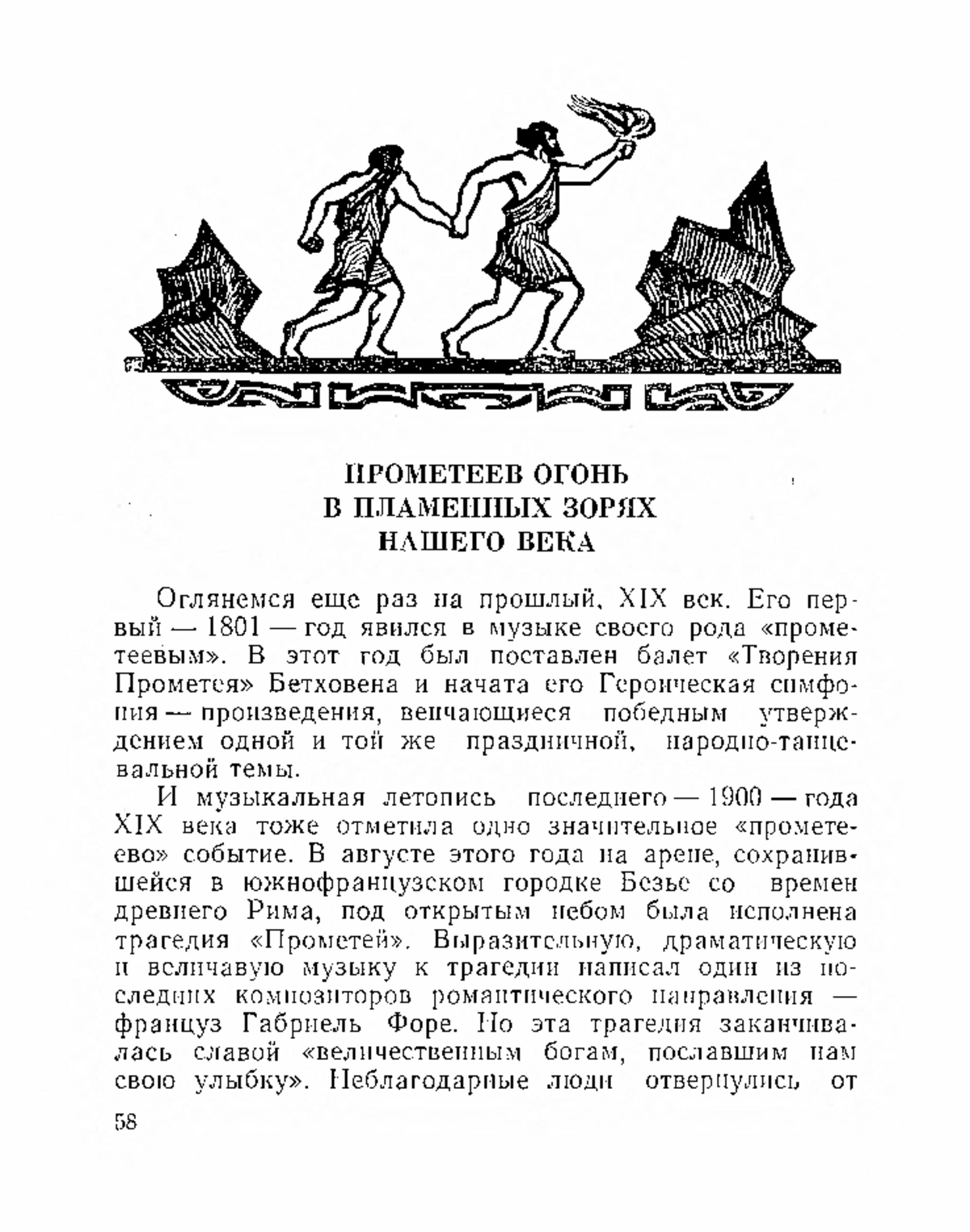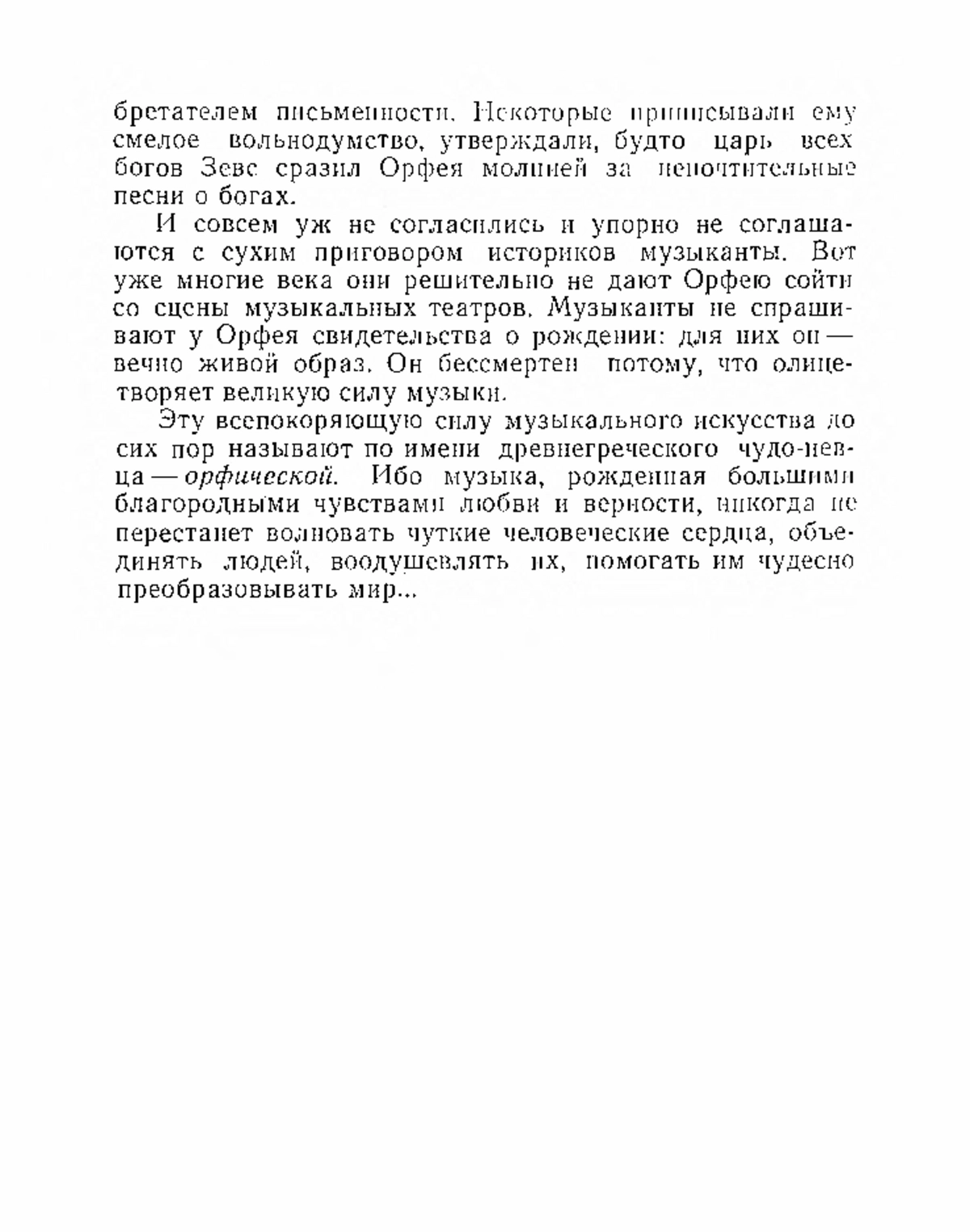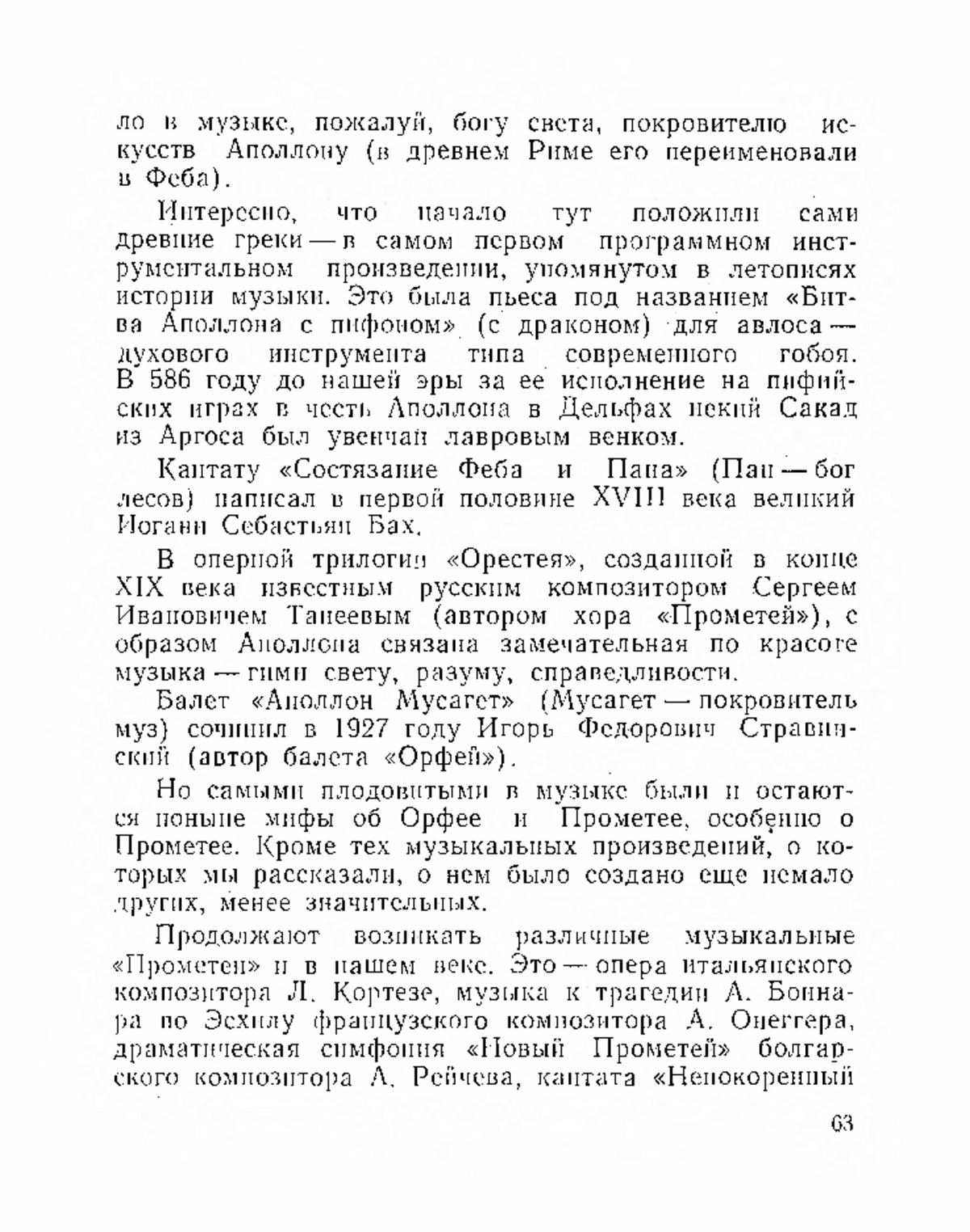 «… А другие античные мифы, другие мифологические герои, кроме Орфея и Прометея, много ли их в стране Музыки? Очень много. Для переписи их потребовалась бы целая тетрадь. Особенно густо заселены античными мифологическими персонажами оперы, балеты, оратории и кантаты XVII-XVIII веков. Значительно реже встречаются они в музыке XIX века. И опять заметно возрастает их число в западноевропейской музыке XX века. Многие мифологические персонажи появляются по нескольку раз - в разные века и в разных музыкальных жанрах…»