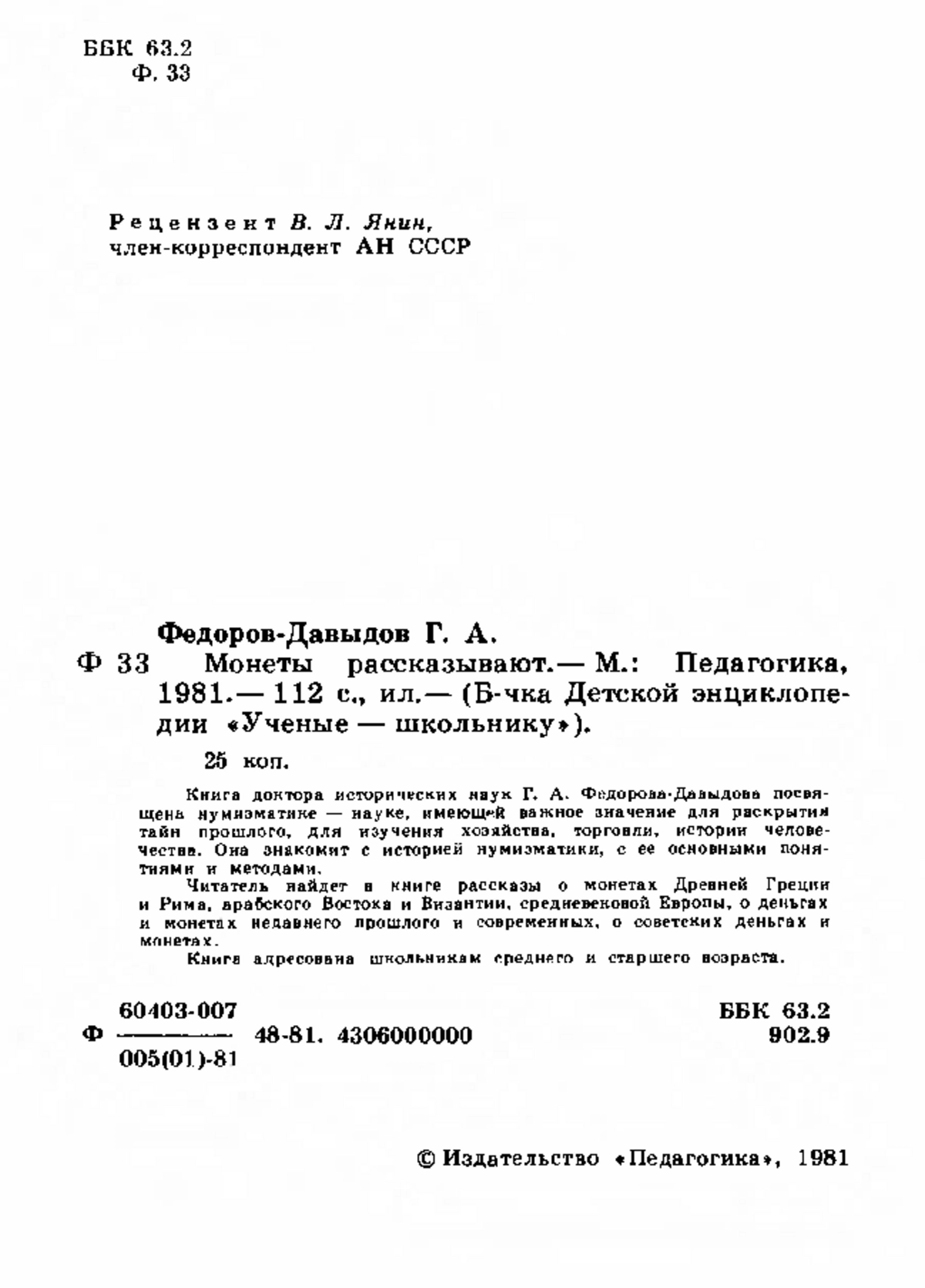 Книга доктора исторических наук Г. А. Федорова-Давыдова посвящена нумизматике — науке, имеющей важное значение для раскрытия тайн прошлого, для изучения хозяйства, торговли, истории человечества. Она знакомит с историей нумизматики, с ее основными понятиями и методами. Читатель найдет в книге рассказы о монетах Древней Греции и Рима, арабского Востока и Византии, средневековой Европы, о деньгах и монетах недавнего прошлого и современных, о советских деньгах и монетах. Книга адресована школьникам среднего и старшего возраста.