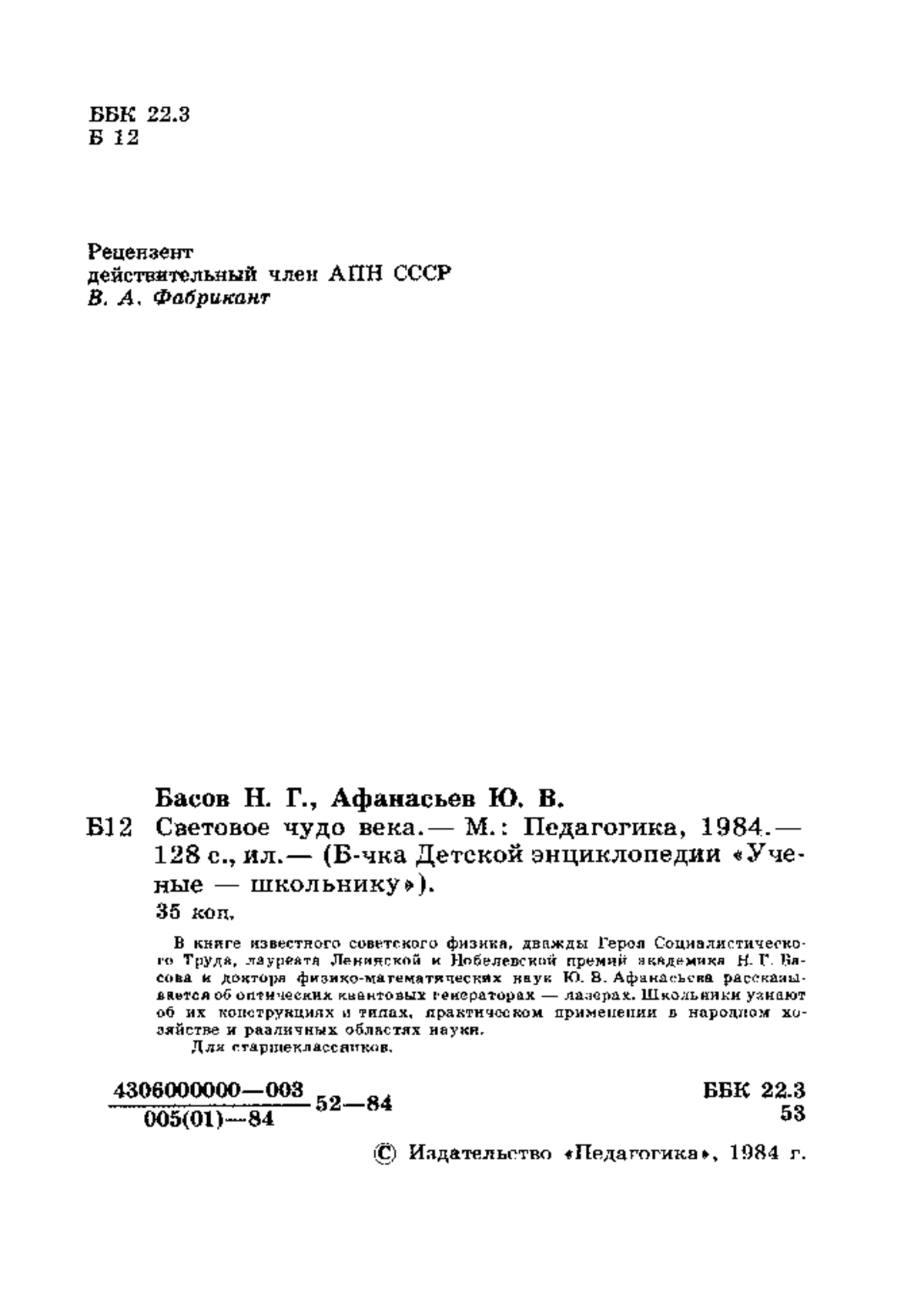 В книге известного советского физика, дважды Героя Социалистического Труда, лауреата Ленинской и Нобелевской премий академика Н. Г. Басова и доктора физико-математических наук Ю. В. Афанасьева рассказывается об оптических квантовых генераторах — лазерах. Школьники узнают об их конструкциях и типах, практическом применении в народном хозяйстве и различных областях науки. Книга предназначена для старшеклассников.