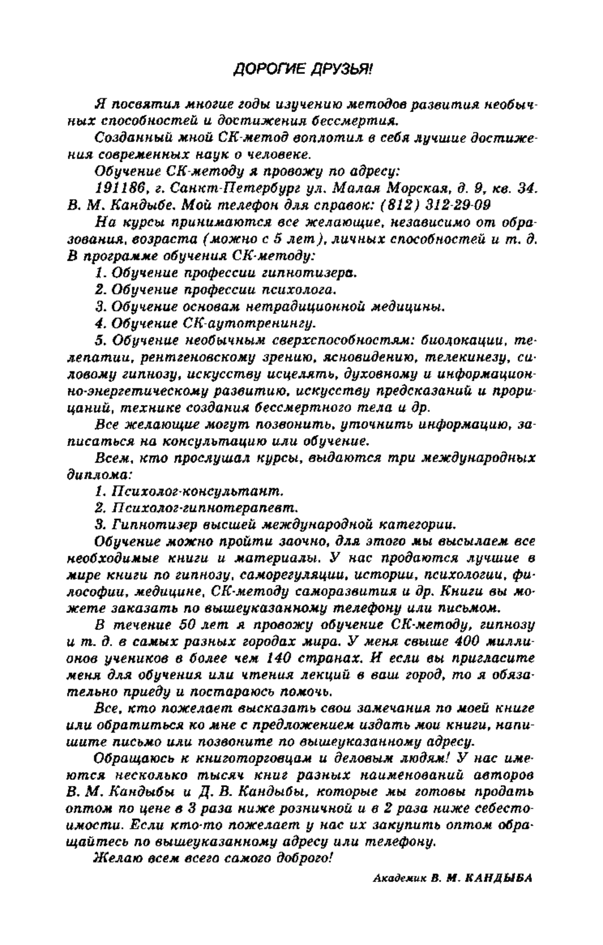 Автор — знаменитый киевский ученый и гипнотизер, академик Виктор Михайлович Кандыба, в своей новой книге впервые в мире публично раскрывает секреты новейшего сенсационного открытия русских ученых в области психического саморазвития.