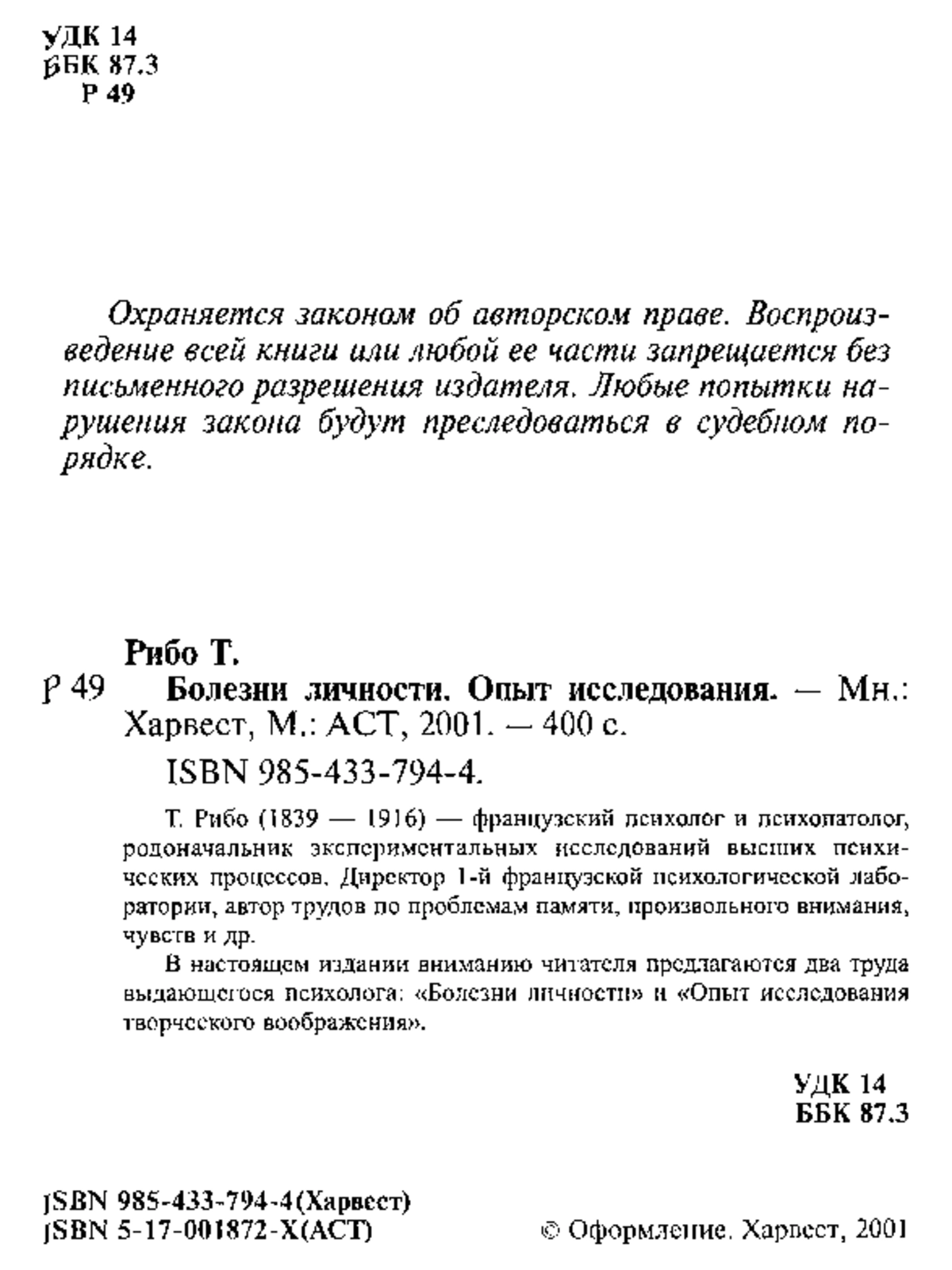 Рибо Т. Болезни личности. Опыт исследования. — Мн.: Харвест, М.: АСТ, 2001. — 400 с.