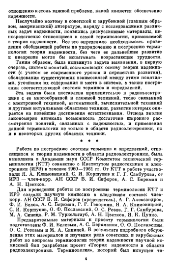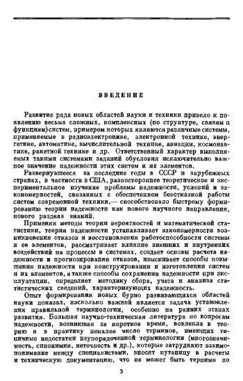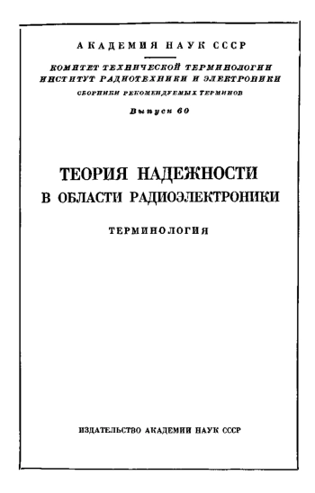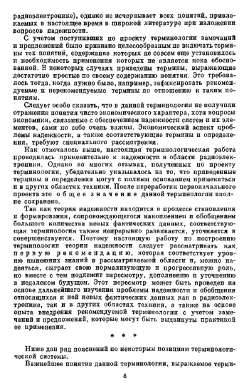 Развернувшееся за последние годы в СССР и зарубежных странах, в частности в США, разностороннее теоретическое и экспериментальное изучение проблемы надежности, условий и закономерностей, связанных с обеспечением безотказной работы систем современной техники,— способствовало быстрому формированию теории надежности как нового научного направления, нового раздела знаний. В книге была выдвинута задача выявления, в первую очередь, системы понятий, составляющих основу теории надежности (с учетом ее современного уровня и перспектив развития), обследования существующих взаимосвязей между этими понятиями, уточнения их содержания и места в системе, а также построения соответствующей системы терминов и определений. Эта задача была поставлена применительно к радиоэлектронике с ее многообразной и сложной техникой, тесно связанной с электронной техникой, автоматикой, вычислительной техникой и другими актуальными областями техники, развитие которых опирается на новейшие достижения естествознания. Отсюда вполне закономерно вытекала возможность достаточно широкого рассмотрения понятий, связанных с надежностью, и применения данной терминологии не только в области радиоэлектроники, но и в некоторых других областях техники.