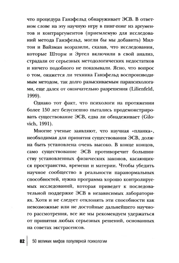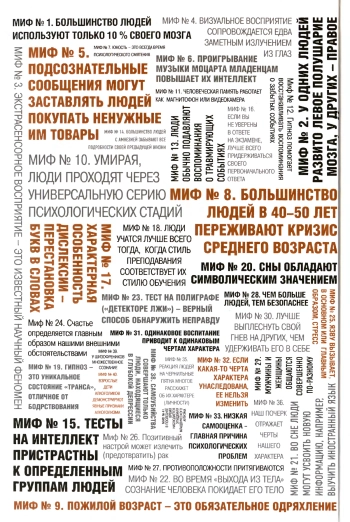 Книга известных американских ученых развенчивает 50 распространенных мифов популярной психологии, которые не только бытуют в нашей жизни, но и применяются на практике многими психологами. Вот некоторые из мифов, о которых говорится в книге: низкая самооценка — главная причина психологических проблем; «кризис среднего возраста» неизбежен для всех; противоположности притягиваются; во сне человек может усвоить новую информацию; прослушивание младенцем классической музыки повышает его интеллект…