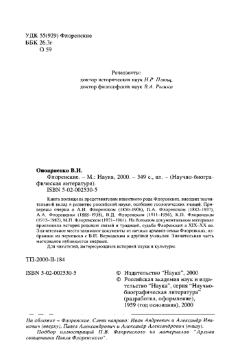 Книга посвящена представителям известного рода Флоренских, внесших значительный вклад в развитие российской науки, особенно геологических знаний. Приведены очерки о А. И. Флоренском (1850-1908), П. А. Флоренском (1882-1937), А. А. Флоренском (1888-1938), В. П. Флоренском (1911-1956), К. П. Флоренском (1915-1982), М. П. Флоренском (1921-1961). На большом документальном материале прослежена история родовых связей и традиций, судьба Флоренских в XIX-XX вв. Значительное место занимают документы из личных архивов семьи Флоренских, избранное из переписки с В. И. Вернадским и другими учеными. Значительная часть материалов публикуется впервые. Книга для читателей, интересующихся историей науки и культуры.
