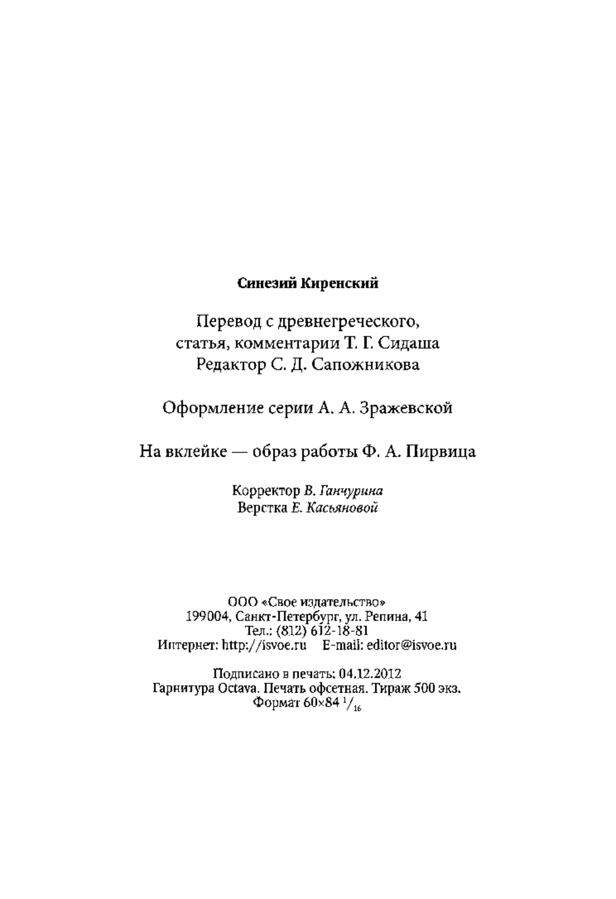 Синезий Киренский. Трактаты и гимны. — Санкт-Петербург: «Свое издательство», 2012. — 568 с., или.