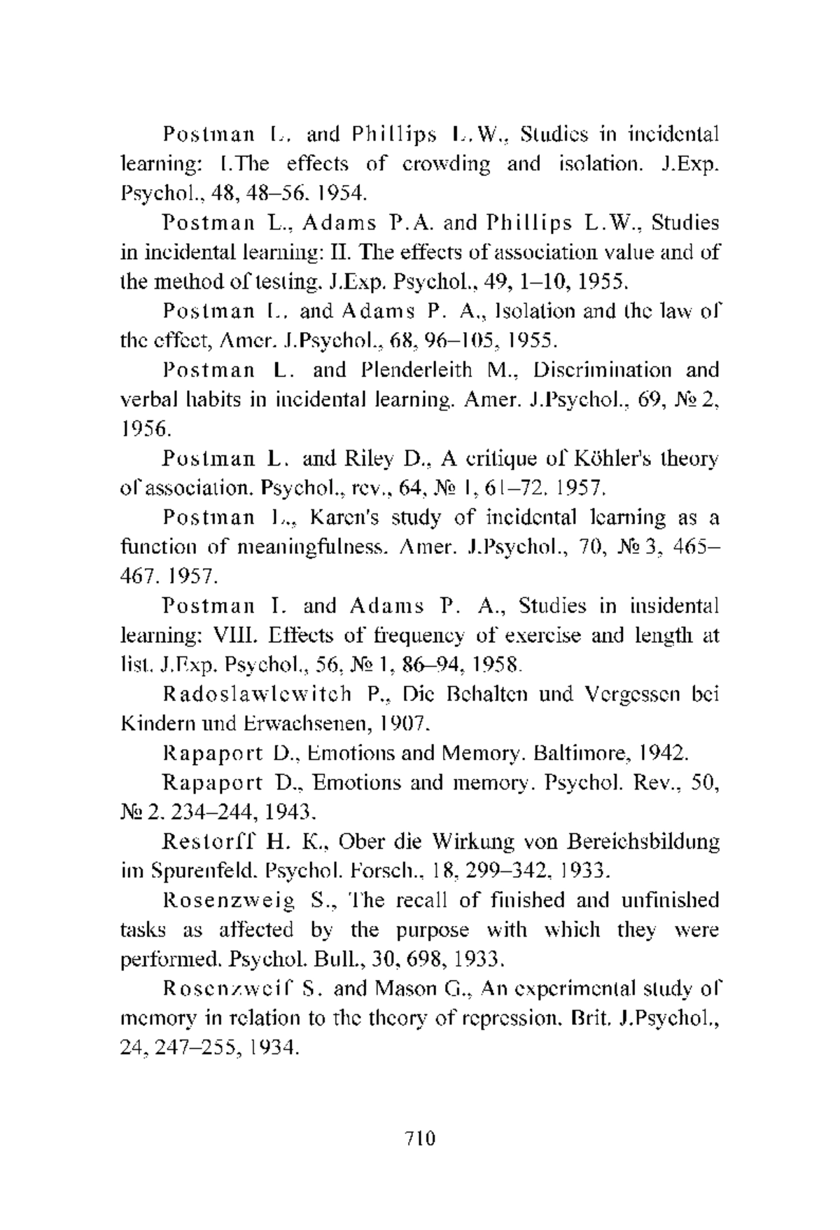 В силу ряда причин, которые будут обсуждаться в дальнейшем изложении, непроизвольная (непреднамеренная) память остается малоизученной. Ее считают случайной, не имеющей своих собственных закономерностей. Это – ошибочное мнение; однако именно поэтому в нашей учебной литературе по психологии и педагогике ограничиваются обычно лишь характеристикой произвольной памяти. Недооценка непроизвольного запоминания наносит серьезный ущерб и психологии и педагогике памяти.