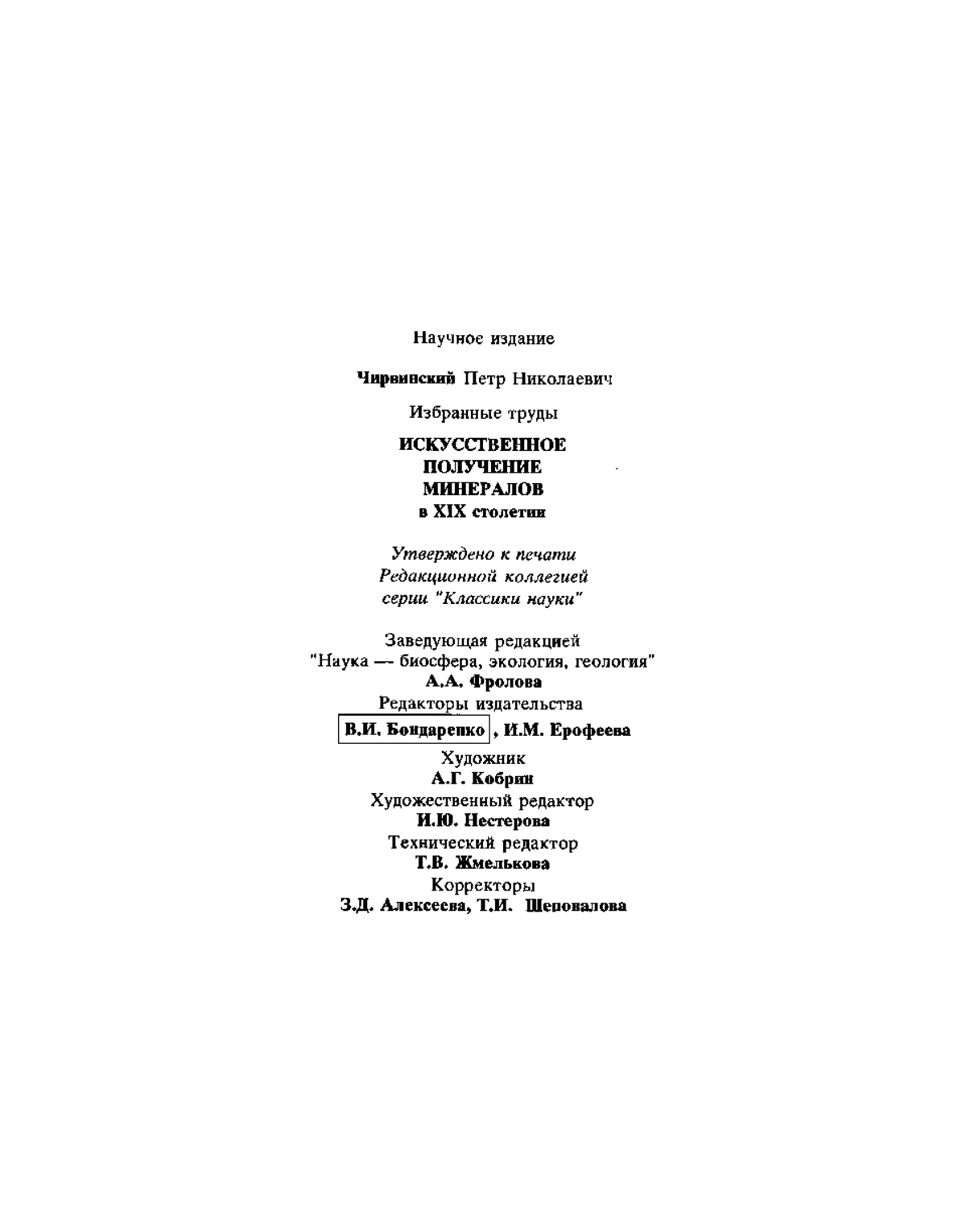 Книга Петра Николаевича Чирвинского “Искусственное получение минералов в XIX столетии”, несмотря на то что она появилась в начале века, не утратила своего значения и теперь. Она может считаться справочником по истории синтеза минералов, необходимым каждому минералогу-экспериментатору, “ростовику”. В книге описано получение различными исследователями с помощью разнообразных методов около 700 минералов. Во многих случаях автор рассматривает эксперимент с позиций главных задач минералогии — выяснения условий образования минералов в природе и влияния синтеза на форму и последовательность кристаллизации минералов. Книга предназначена для геологов, минералогов, петрографов и геохимиков.