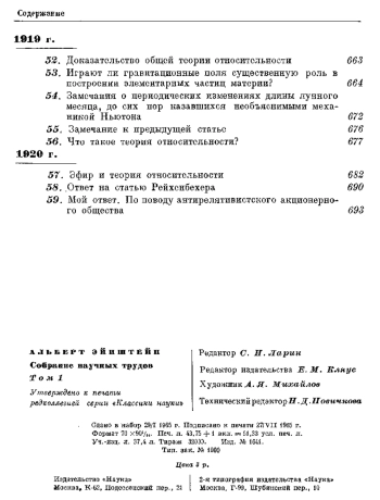Настоящее издание представляет собой первое в мировой литературе фундаментальное собрание научных трудов Эйнштейна. В научном наследстве знаменитого ученого более 200 статей по различным вопросам физики. Подавляющее большинство их после опубликования в журналах не было собрано и издано. Между тем полная картина творчества Эйнштейна имела бы большое научное и культурное значение. Настоящим изданием Академия наук СССР выполняет значительную часть этой почетной задачи. Книга содержит небольшое число примечаний редактора, цель которых, во-первых, указать важнейшие библиографические данные и, во-вторых, — подчеркнуть основные этапы развития теории. Примечания по возможности краткие: даже современному физику нелегко добавить что-нибудь к логической цели рассуждений великого автора.